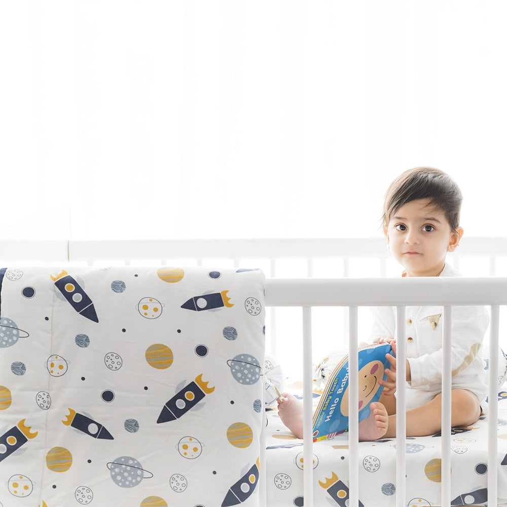 The Yellow Doodle Oh-So-Cozy Comfort Quilt is practically a soft cloud of cuddles, snuggles, and all things comfy. Make your mini-me's nap session that much cozier with our premium comfort quilt, crafted with GOTS certified 100% organic cotton and a light fibre fill, gentle to your baby's delicate skin. Your little one will settle quickly into the calming heap of this gorgeous comfy quilt. Your baby's first 'must have' nursery accessory, providing an added layer of warmth and comfort. SIZE & MAKE- 100% GOTS Certified Organic Cotton Exterior with light fibre filling, that will not clump over time. Reversible with a print at back. Perfectly sized with elegant designs, 110 x 90 cm. Hypoallergenic, Environment- friendly AZO free dyes. CARE- Machine-washable, of course!Gentle cycle, use mild detergents, no bleach, tumble dry low. Handmade with care in India.