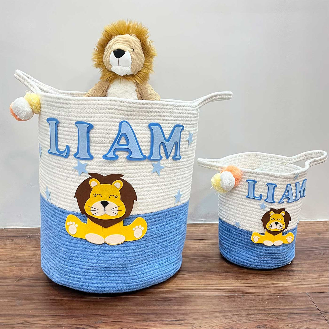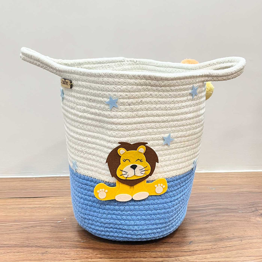 Our Basket crafted from durable jute and soft cotton, it offers both sturdiness and comfort. Perfect for carrying books, toys, or treasures, this basket is as functional as it is enchanting. Elevate your child's storage with a sprinkle of magic and practicality, and let their imagination soar among the stars. This Regal Roar theme basket in bright hues serves as a dual purpose of both kid's room decor as well as storage made easy with two convenient sizes and comes embellished with delightful designs of Lion.
