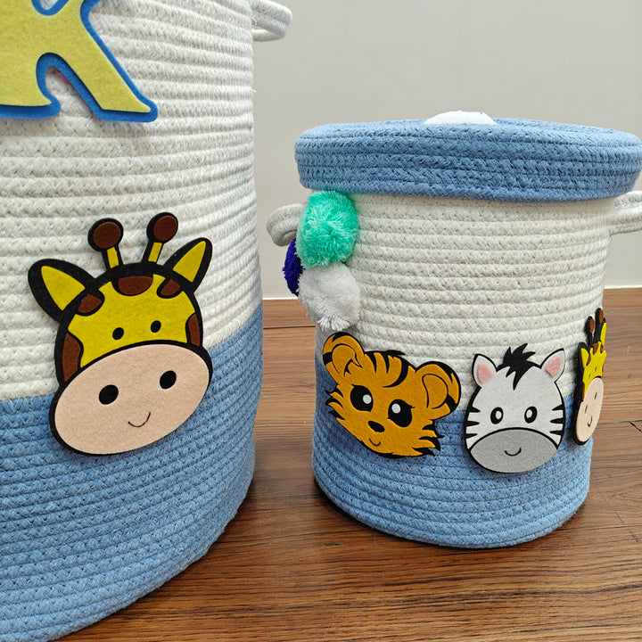 Our Basket crafted from durable jute and soft cotton, it offers both sturdiness and comfort. Perfect for carrying books, toys, or treasures, this basket is as functional as it is enchanting. Elevate your child's storage with a sprinkle of magic and practicality, and let their imagination soar among the stars. This Zooblu theme basket in bright hues serves as a dual purpose of both kid's room decor as well as storage made easy with two convenient sizes and comes embellished with delightful designs of Tiger , Zebra ,Giraffe .