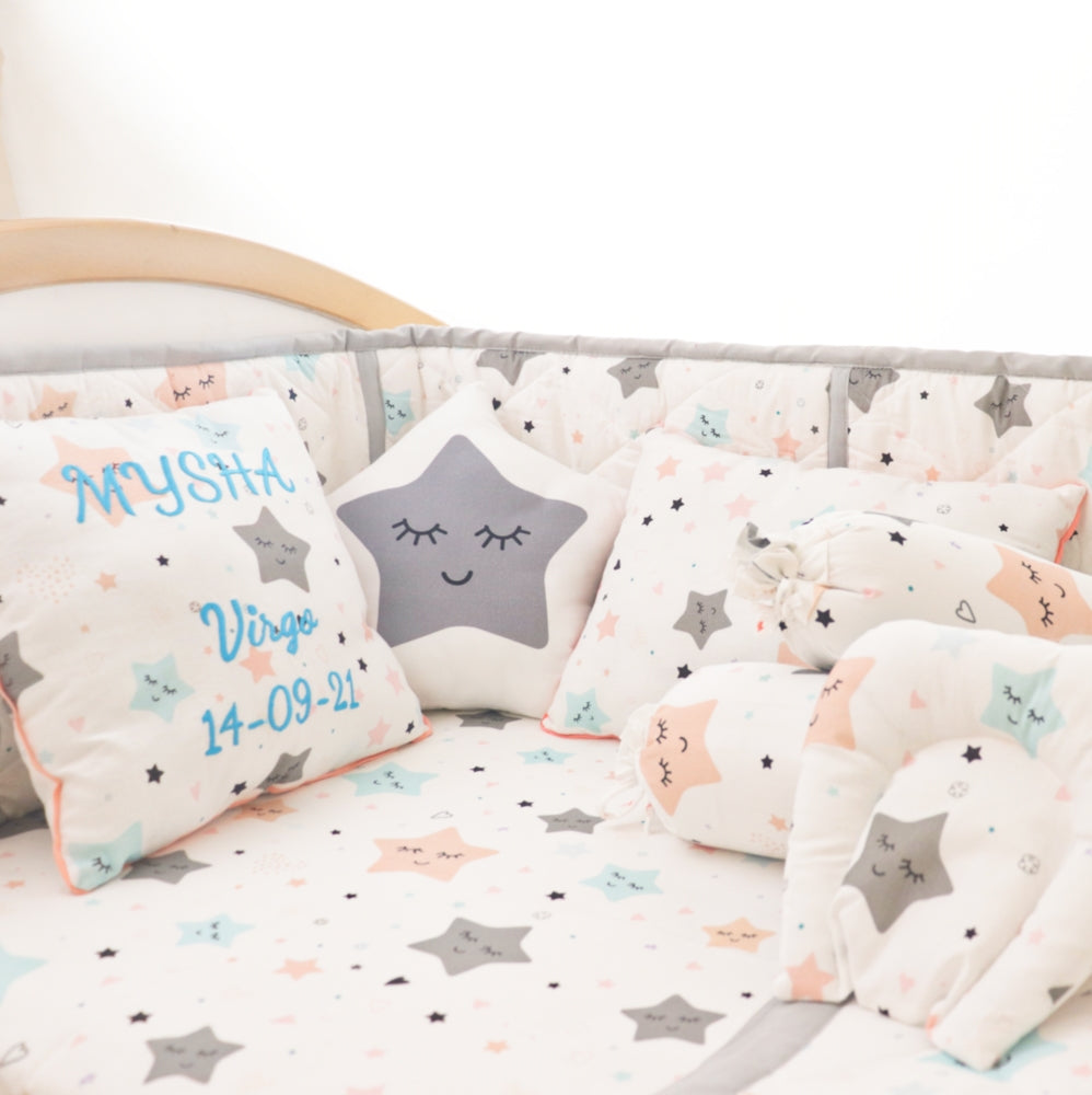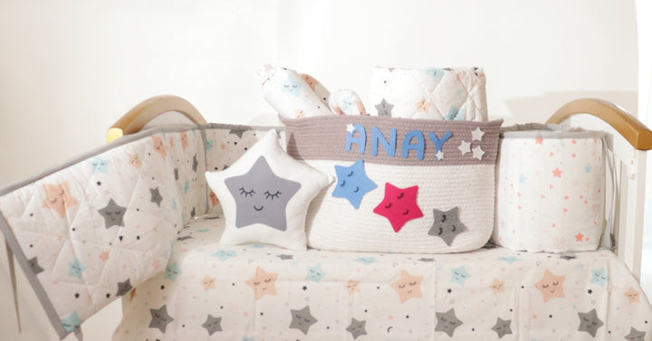 Hypoallergenic, environment- friendly AZO free dyes. CARE- Machine-washable, of course! Gentle cycle, use mild detergents, no bleach, tumble dry low.   Handmade with care in India. PS- Enjoy free personalisation on Basket & Shape Cushion! 300/- extra (each) for personalisation on Quilt/ Bumper or 1 Bolster.