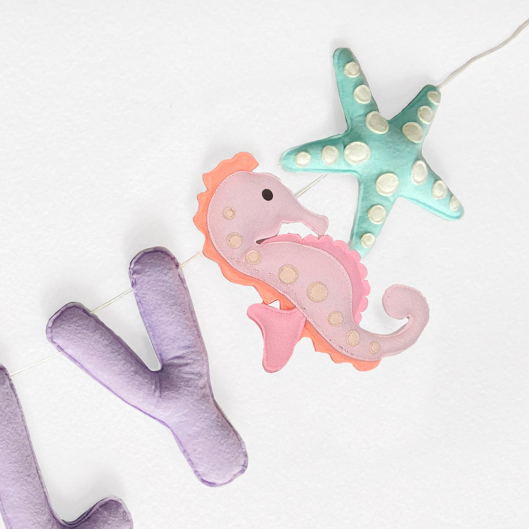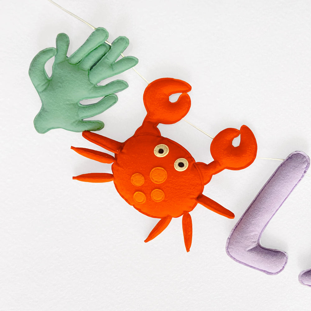 Our cute Customised felt under water animals themed garland immediately sets the tone to your kid’s room décor. These can be hung across walls or on cribs or the kids shelf or kids room door. Decorated with different colourful seahorse & crab, this bunting can make perfect addition to the kid’s room theme.
