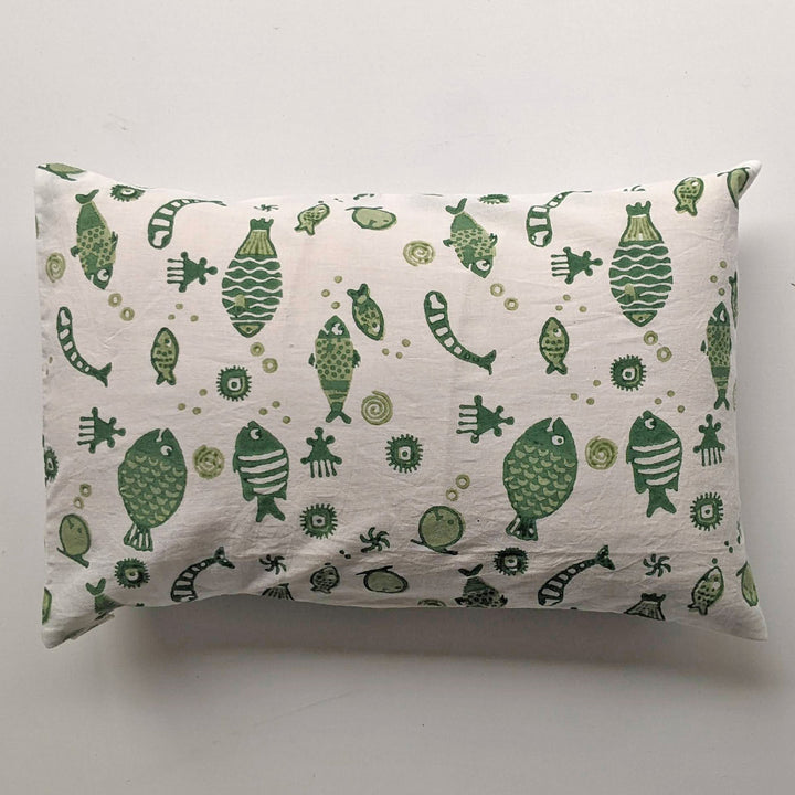 1 x Koi Print Pillow: Our 9 x 14 inches toddler pillows are designed to be a perfect bedtime companion for your little ones. Buttery soft and comfortable they are filled with 100% hypoallergenic semal that is safe and more friendly to your munchkin's health. The outer cover is 100% organic cotton and handblock printed with azo-free colours. The pillow inserts are made in West Bengal while the pillowcovers are printed and stitched in Gujarat. 1 x Swaddle: 100% GOTS certified organic cotton fabric with matching fish print as the pillow.