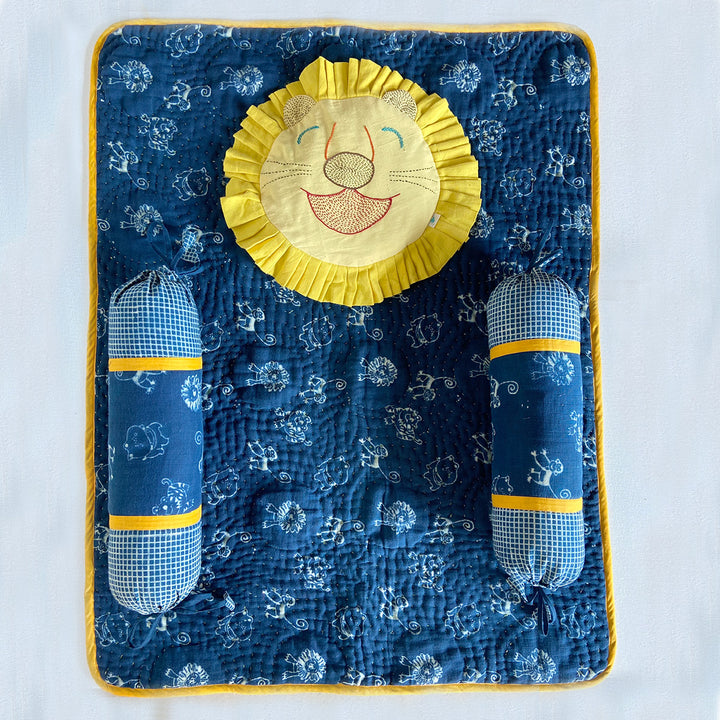 Set contains: 1 x Organic Cotton Receiving Blanket: This reversible organic cotton baby receiving blanket uses four layers of fabric and cotton wadding together making it ideal for snuggling as they leave the hospital. Hand quilted by women artisans in Ahmedabad. 1 x Organic Cotton Mustard Seeds Pillow: It is recommended to use the pillow after a few weeks of birth till the baby starts rolling on his/her tummy. 2 x Organic cotton Kapok filled Bolsters: Buttery soft and comfortable they are filled with 100% hypoallergenic semal that is safe and more friendly to your munchkin's health. The outer cover is 100% organic cotton and handblock printed with natural indigo colour. The pillow inserts are made in West Bengal while the pillowcovers are printed and stitched in Gujarat. 2 x Wooden Maracas: Crafted from sustainably sourced rubber wood and painted with child-friendly water-based colours. Ergonomically shaped handles are perfect for a child's grip or for you to shake shake shake! Conscious of minimising waste, the set comes packed in a reusable muslin bag with an interactive paper game tag, ready for gifting. Designed and made in India.