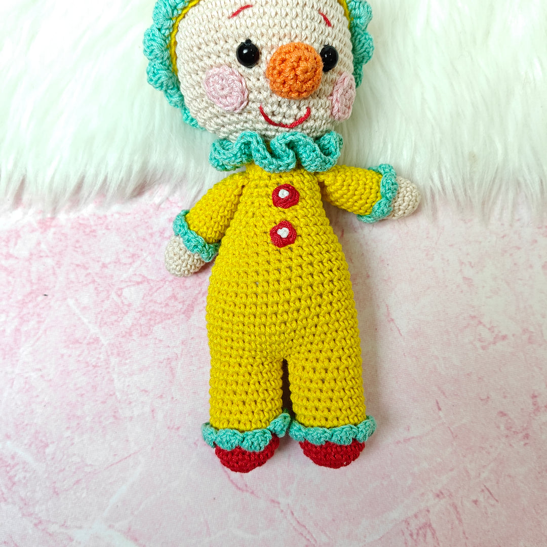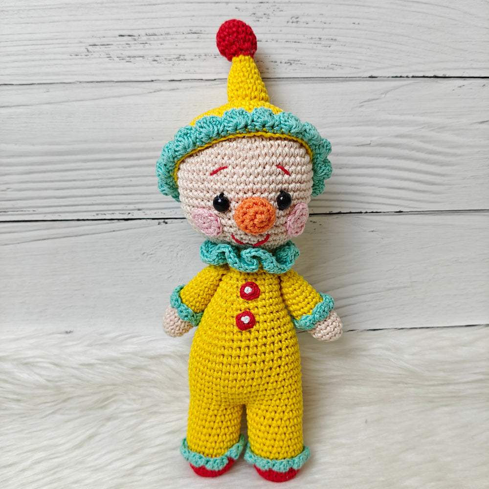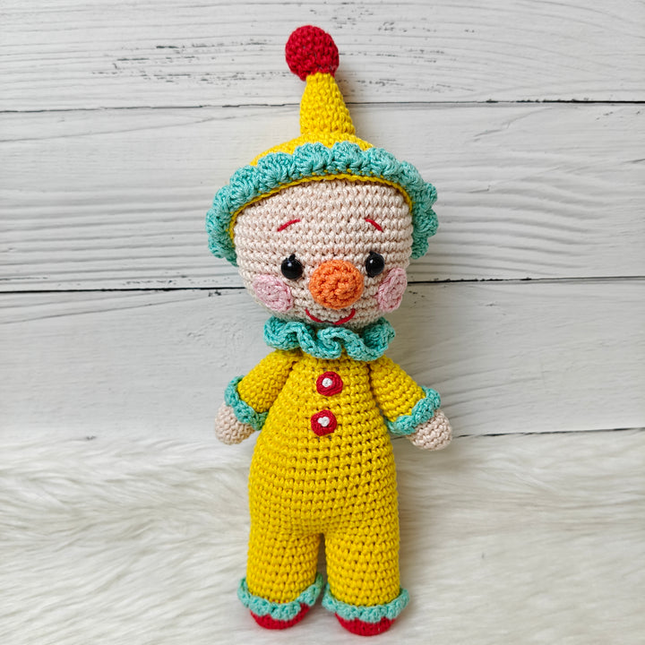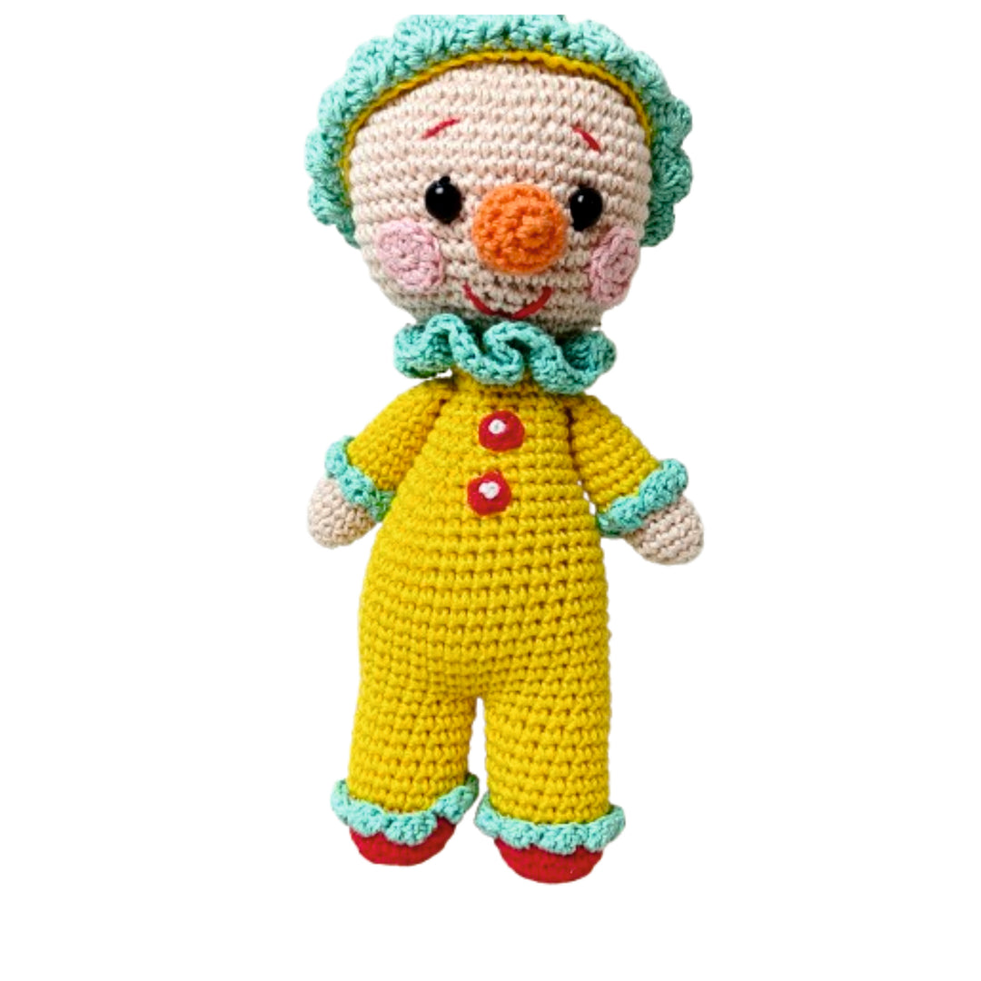 Chunky Charlie is a delightful handmade crochet clown, dressed in a bright yellow jumpsuit with red button accents and playful turquoise frills. With his rosy cheeks, wide smile, and cheerful personality, Charlie is ready to spread laughter, joy, and a carnival of fun wherever he goes. Carefully crafted with love and attention to detail, Chunky Charlie isn’t just a toy — he’s a whimsical companion and a treasured keepsake.