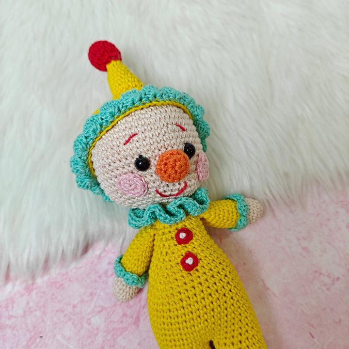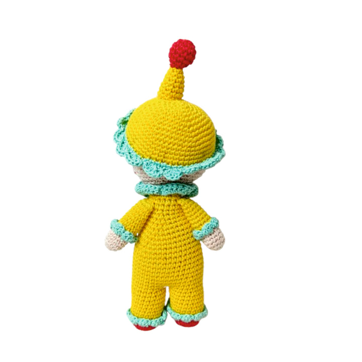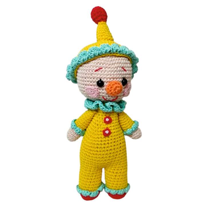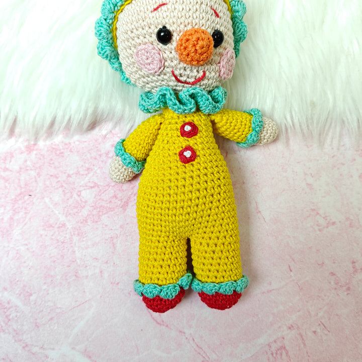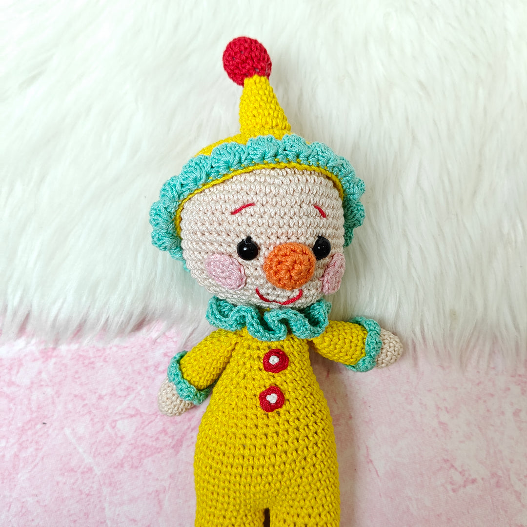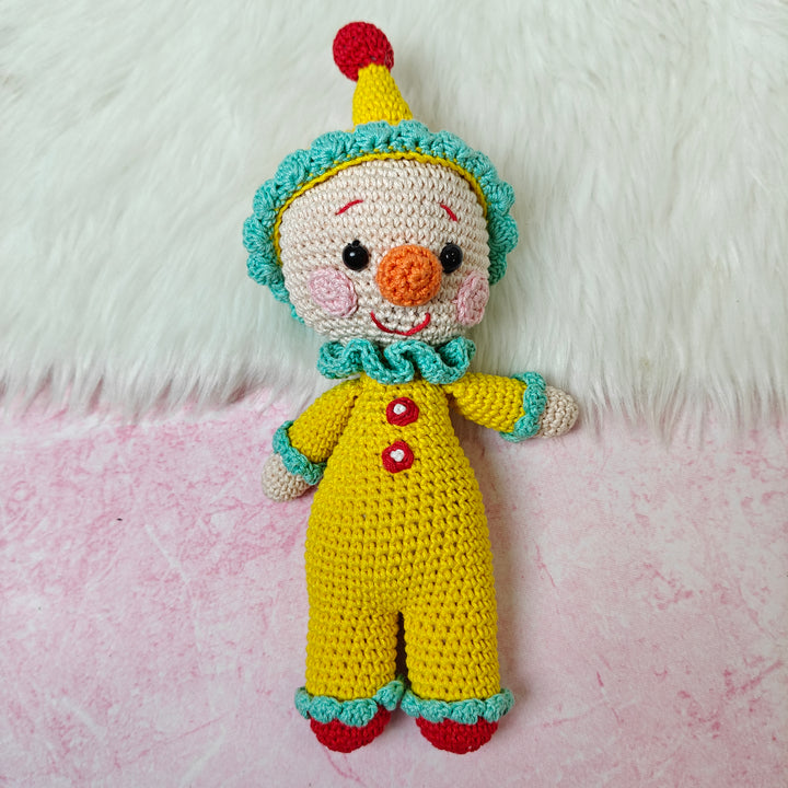Chunky Charlie is a delightful handmade crochet clown, dressed in a bright yellow jumpsuit with red button accents and playful turquoise frills. With his rosy cheeks, wide smile, and cheerful personality, Charlie is ready to spread laughter, joy, and a carnival of fun wherever he goes. Carefully crafted with love and attention to detail, Chunky Charlie isn’t just a toy — he’s a whimsical companion and a treasured keepsake.