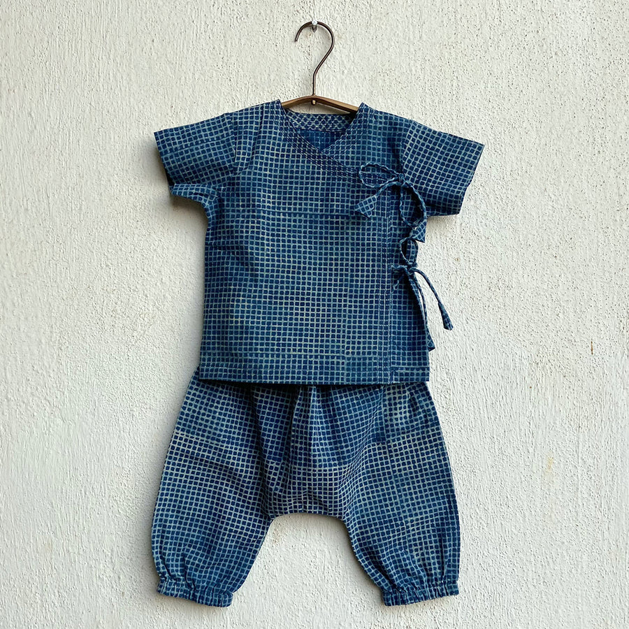 1 x angarakha top: 100% organic cotton hand block printed checks top created by traditional Ajrakh artisans in naturally hypoallergenic indigo colour. Tie-up closures and flat seams for ease of wearing and fit. Stitching detail on the neckline adds stability and aesthetic value. 1 x pants: 100% organic cotton matching pants. Elasticated waistband and bottom hem. Part of our Zoo Treat collection. Conscious of minimising waste, the set is packed in a reusable muslin bag with an interactive paper game tag, ready for gifting.