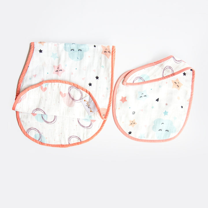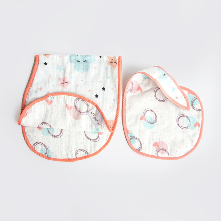 2 Swaddles- 105 x 105 cm each (single layer), 1 Reversible Bib- 37 long x 22 wide cm (3 layers), 1 Reversible Burpy cloth- 60 cm long x 25 cm wide (3 layers), 2 Wipes- 30 x 30 cm each (2 layers). 1 Medium Cotton Rope Basket- 30 x 20 x 20 cm