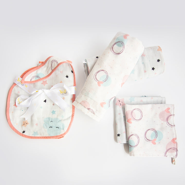 The Yellow Doodle must- have baby essentials set features an array of iconic prints in our classic muslin. This beautiful six piece set includes two swaddles, one burpy cloth, one baby bib & two muslin wipes, made from 100% organic cotton muslin. Super absorbent, breathable and lightweight, this pack is a great go-to for all those everyday mucky messes.