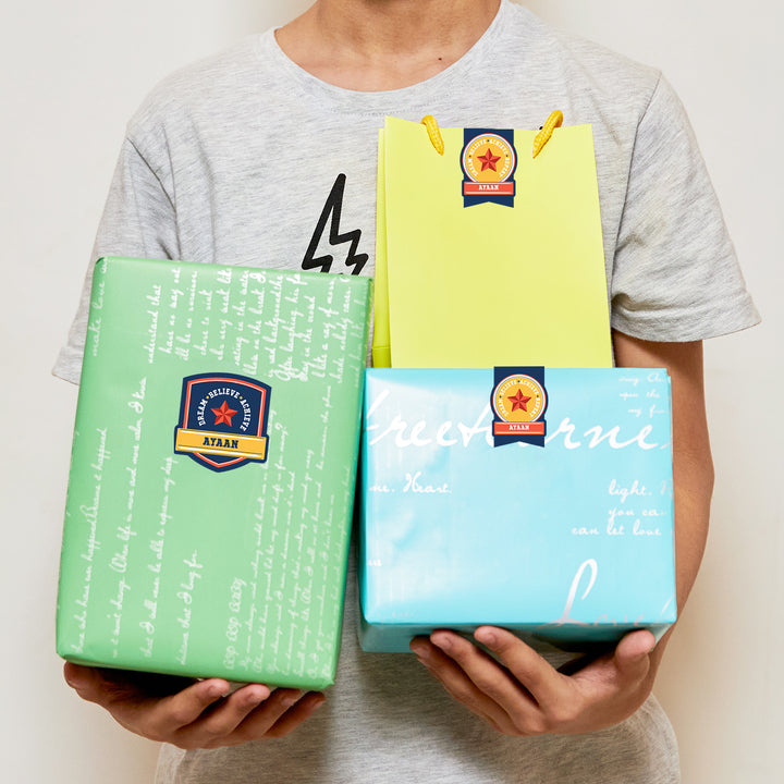 Elevate your gifting game with personalized water-resistant Name Stickers. You can easily use them to seal gift bags & boxes and also to add your kids name to their birthday return favours & more! These stickers also work great for all your easy-to-lose school supplies like pencils, rulers, small toys etc.