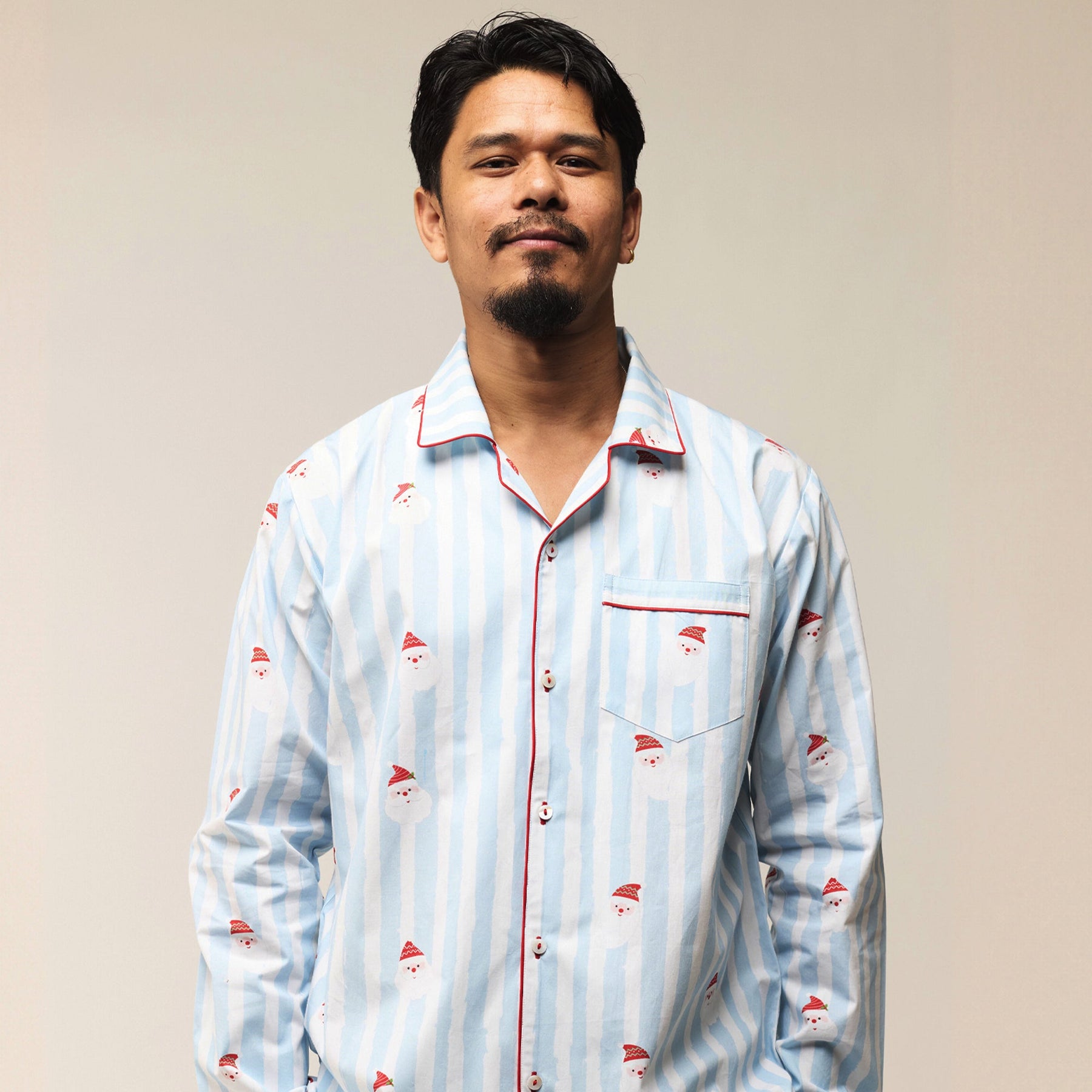 righten up your holidays with this adorable pajama set featuring winter-blue stripes decorated with cheerful Santa motifs for a playful festive touch. The set includes a super-soft full-sleeve notched-collar top and coordinated pajamas with contrast cording. The pajamas have a soft elastic waist and both pieces are tagless for comfort. Personalization is available on the top pocket. The pajamas include two front pockets and the set comes beautifully packed in a matching fabric gift bag, ready for gifting.