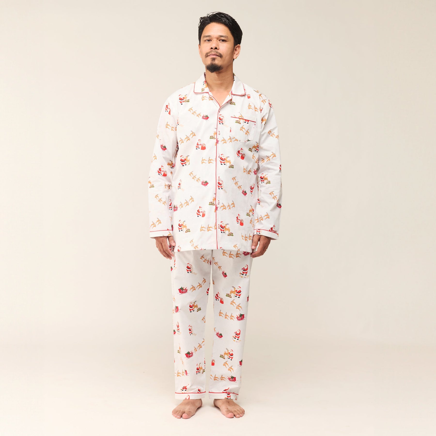 Get into the holiday spirit with this festive pajama set depicting Santa preparing for Christmas, surrounded by toys, his sleigh, and cheerful reindeer. This set includes a super-soft full-sleeve notched-collar top and matching pajamas with contrast cording. The pajamas have a soft elastic waist and both pieces are tagless for comfort. You can personalize the pocket on the top. Two front pockets in the pajamas add convenience, and the set is beautifully packed in a matching fabric gift bag, ready for gifting