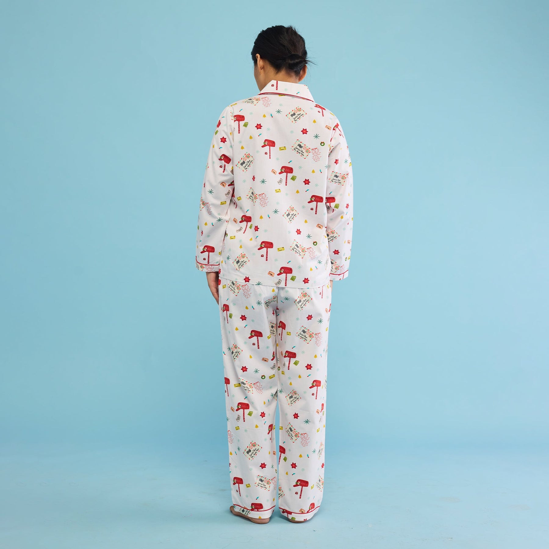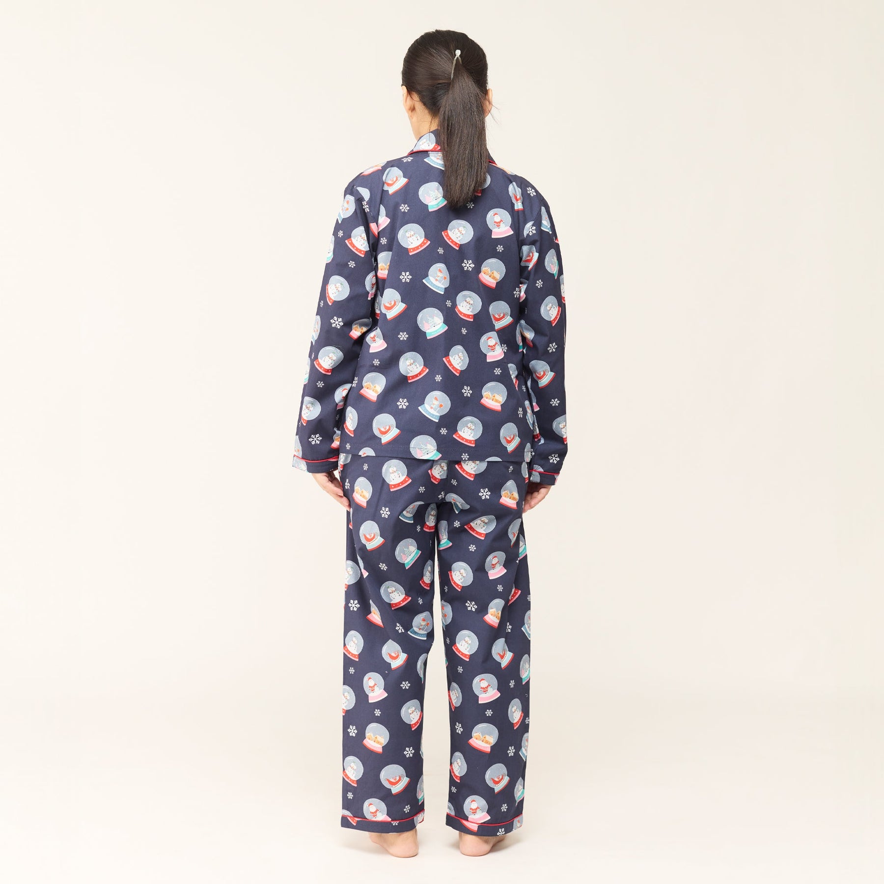 Snuggle into this holiday pajama set designed with a navy backdrop inspired by the night sky, beautifully decorated with playful snowglobes. It includes a super-soft full-sleeve notched-collar top and matching pajamas with contrast cording, a soft elastic waist, tagless comfort, personalization on the pocket, and two front pockets. Packed beautifully in a matching fabric gift bag