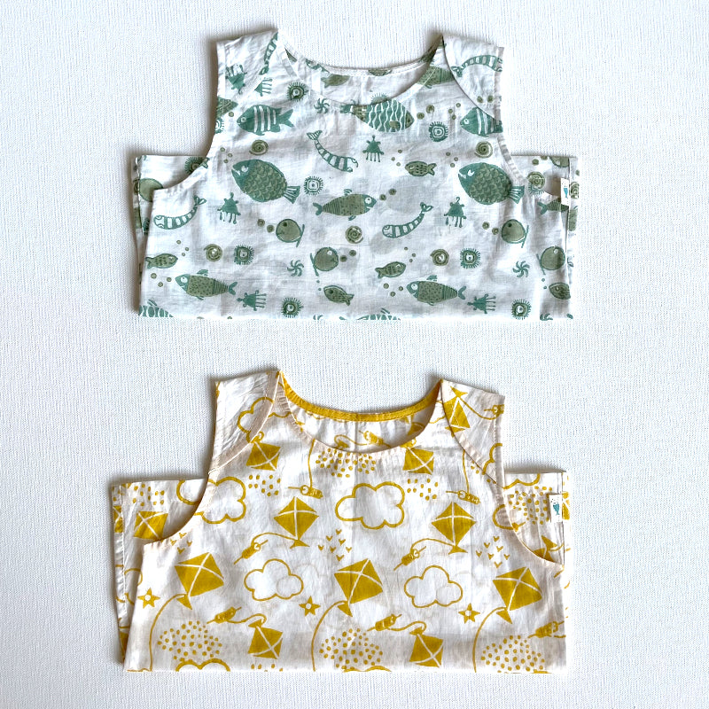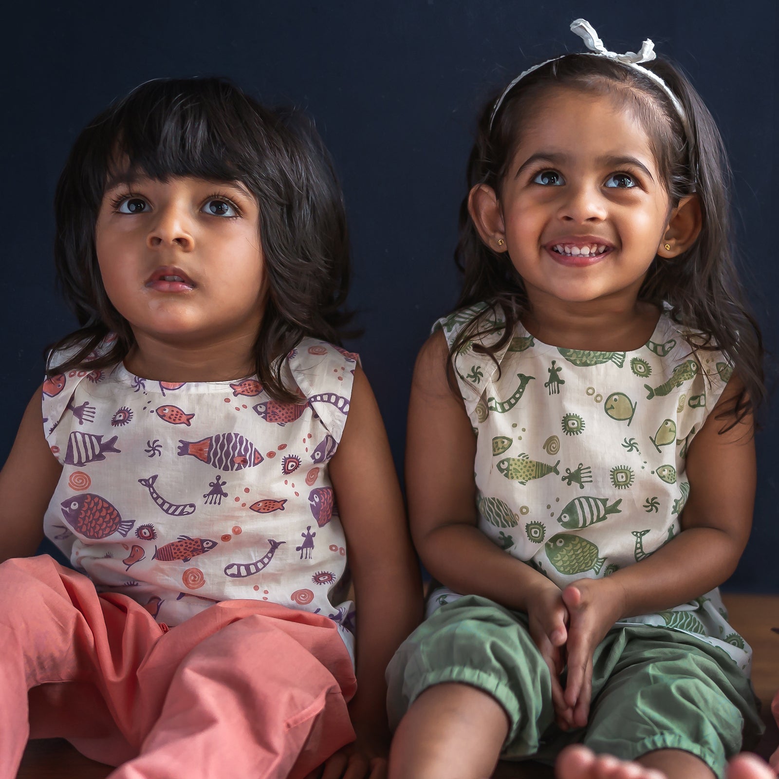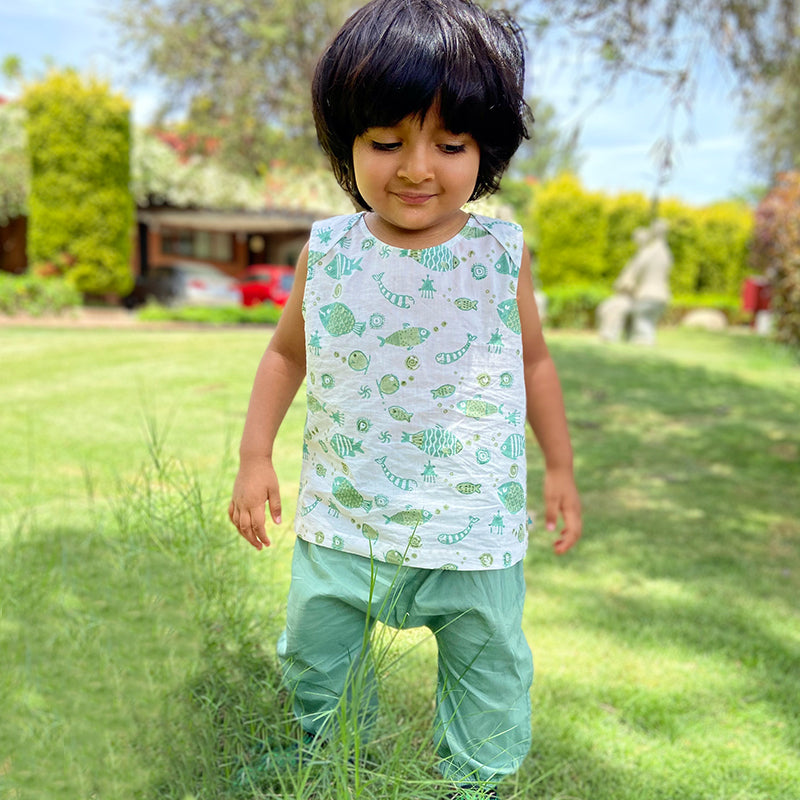 UNISEX ORGANIC FISH PRINT KURTA + MINT PANTS