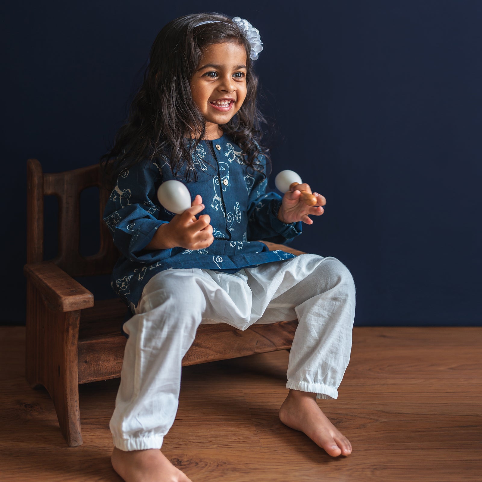 UNISEX ORGANIC ZOO PRINT INDIGO KURTA + WHITE PANTS