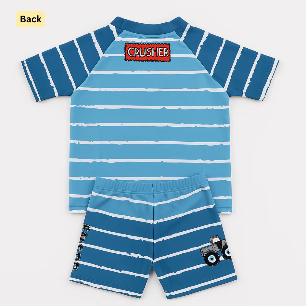 • Matching striped swim shorts with printed monster truck and “CRUSHER” motifs