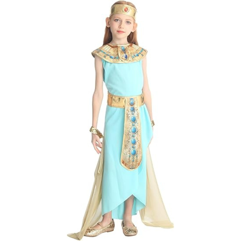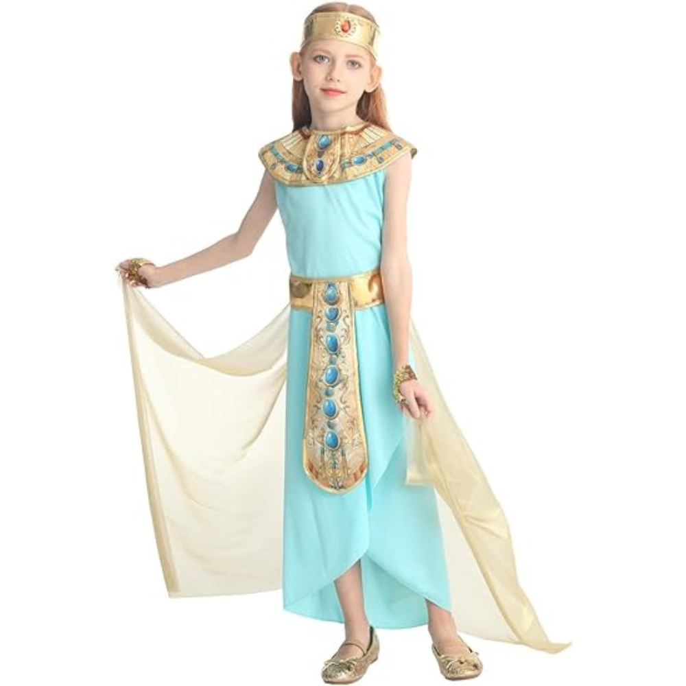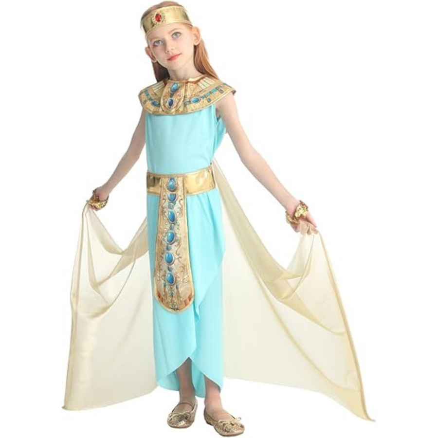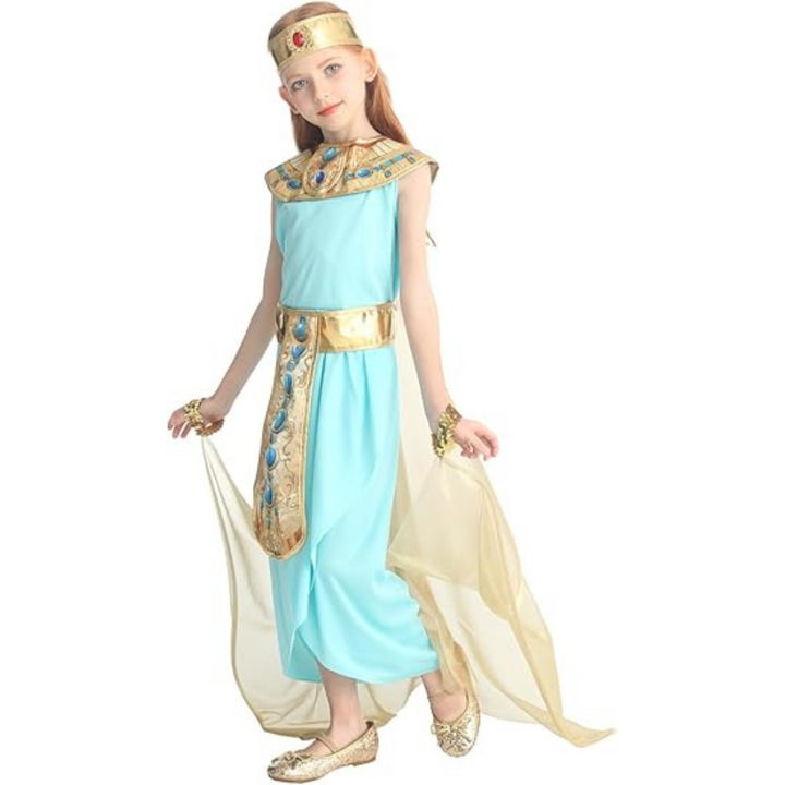 Step into the elegance of Ancient Egypt with the Golden Princess of the Nile costume! With its flowing aqua design and shimmering golden accents, this royal outfit transforms your child into a true Egyptian princess — perfect for Halloween, school plays, or themed dress-up events.
