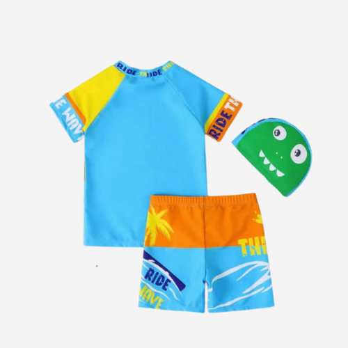Catch every wave with the Dino Wave Rider Swim Set – a bold and colorful beachwear combo designed for young adventurers who love dinosaurs and seaside fun!