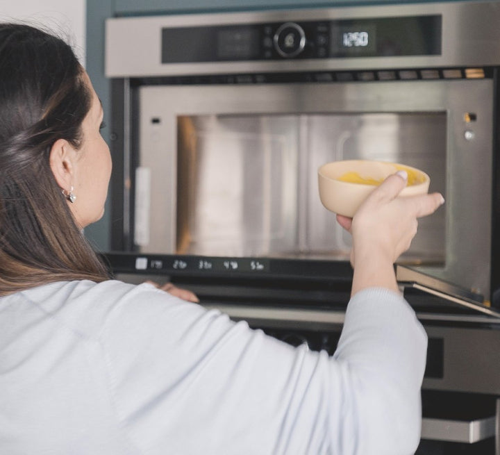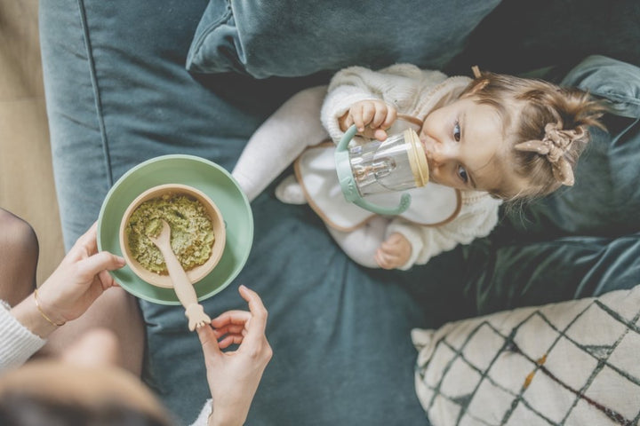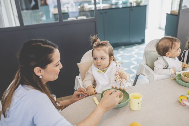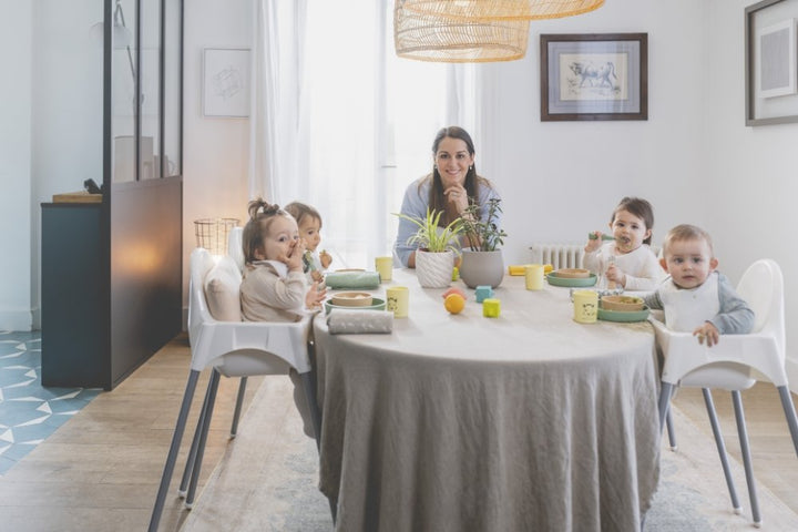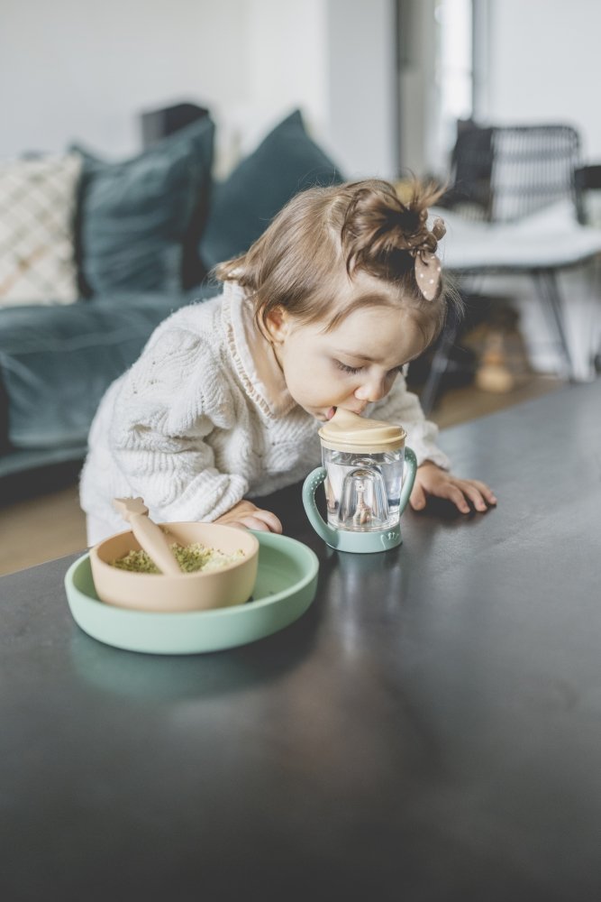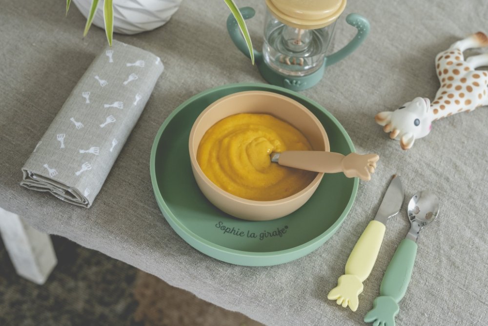 A complete meal set, to accompany baby during his first meals at home or outside. Composed of a plate, a bowl, a cup and a spoon in 100% silicone material.