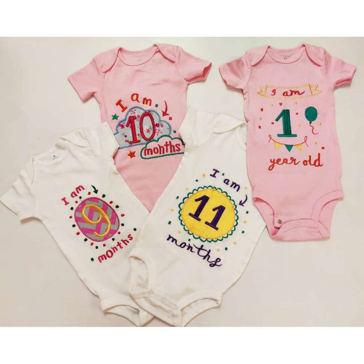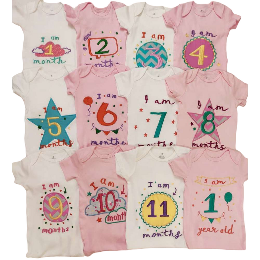 Hand Embroidered Milestone Romper Set of 12 - Bubble thoughts - White Pink White Combination