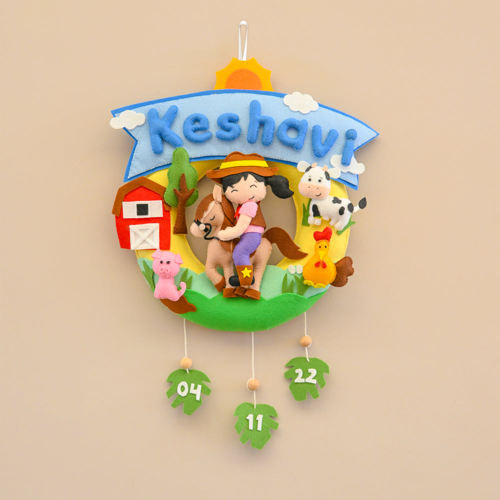 The Personalized Farm-Themed Name Wreath is a charming handcrafted decor piece featuring a cute farmer, playful animals, and a vibrant countryside scene. Customized with your child's name and special date, it adds a lively farm-inspired touch to nurseries or bedrooms, making it an ideal gift for animal-loving kids.