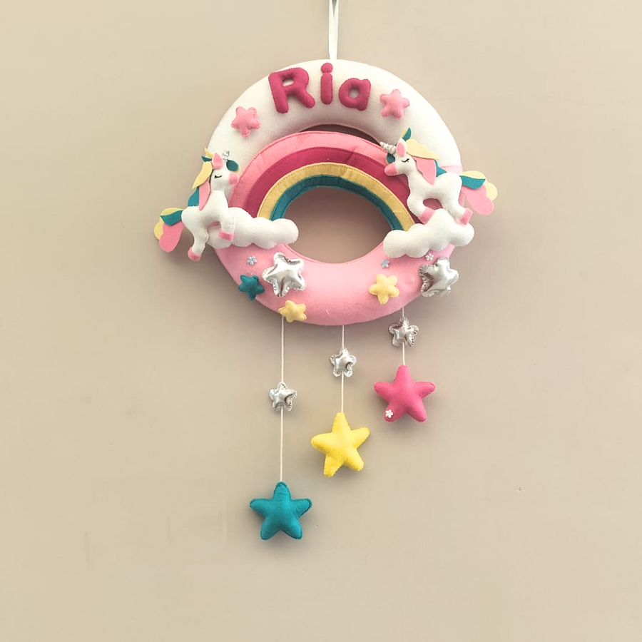 Transform your child’s room into a magical haven with this personalized unicorn and rainbow wreath. Designed with dreamy pastel colors, sparkling stars, and enchanting unicorns, this handcrafted decor adds a whimsical touch. Customize it with your child's name for a unique, heartwarming addition to their nursery or playroom.
