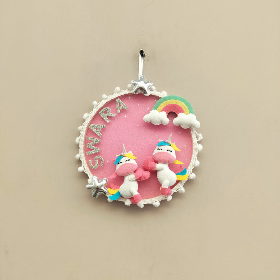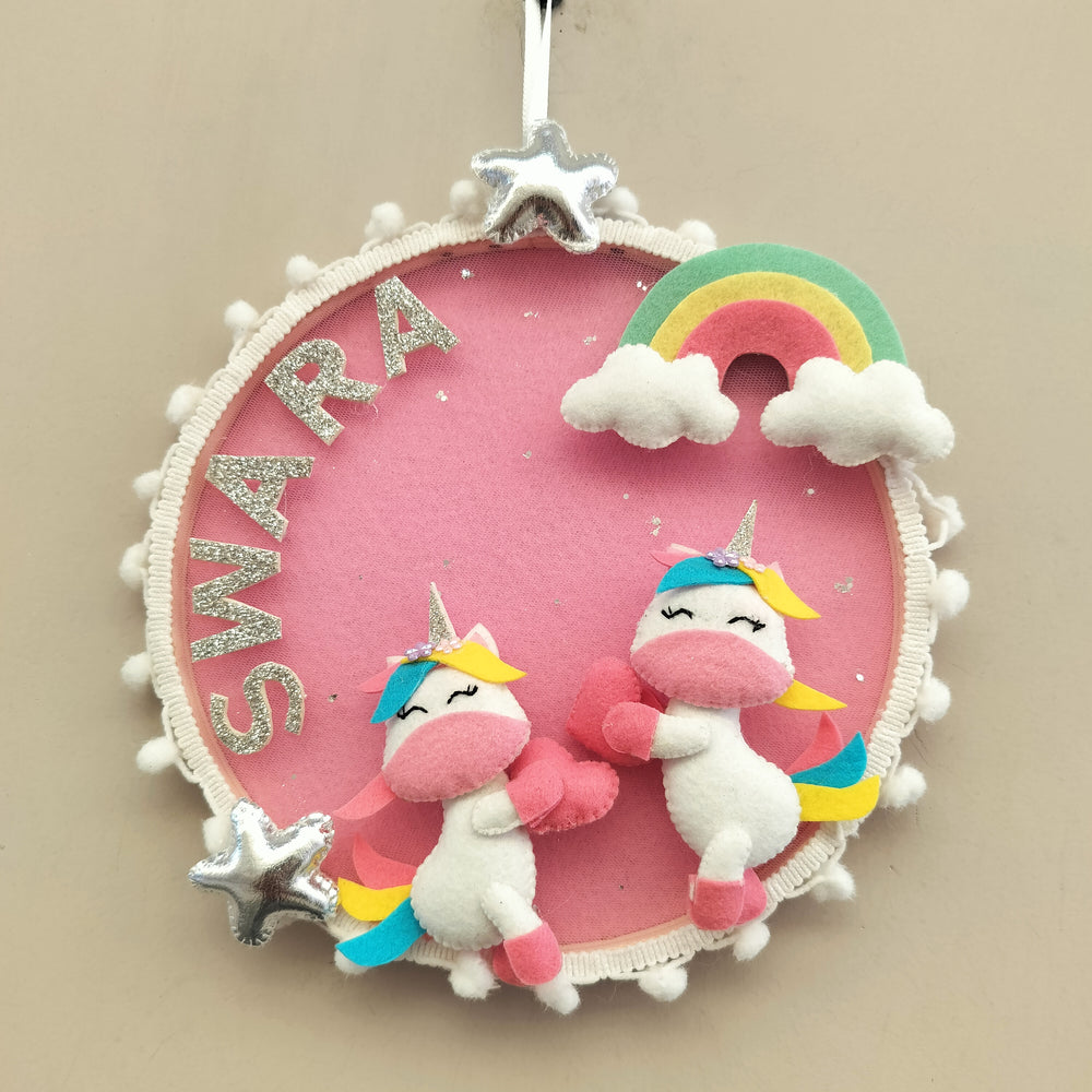 This charming unicorn-themed name hanging makes a delightful addition to any nursery or kids’ room décor. Lovingly handmade from soft felt, it features vibrant colors, plush unicorns, rainbows, fluffy clouds, and sparkling glitter embellishments. Each piece is customized with the child’s name, making it a unique and personal decorative item. Perfect for adding a whimsical touch to a child’s space, it also makes a thoughtful gift for baby showers, birthdays, or as a memorable keepsake. The high-quality craftsmanship and attention to detail ensure it becomes a cherished piece in any home, celebrating the joy and magic of childhood.