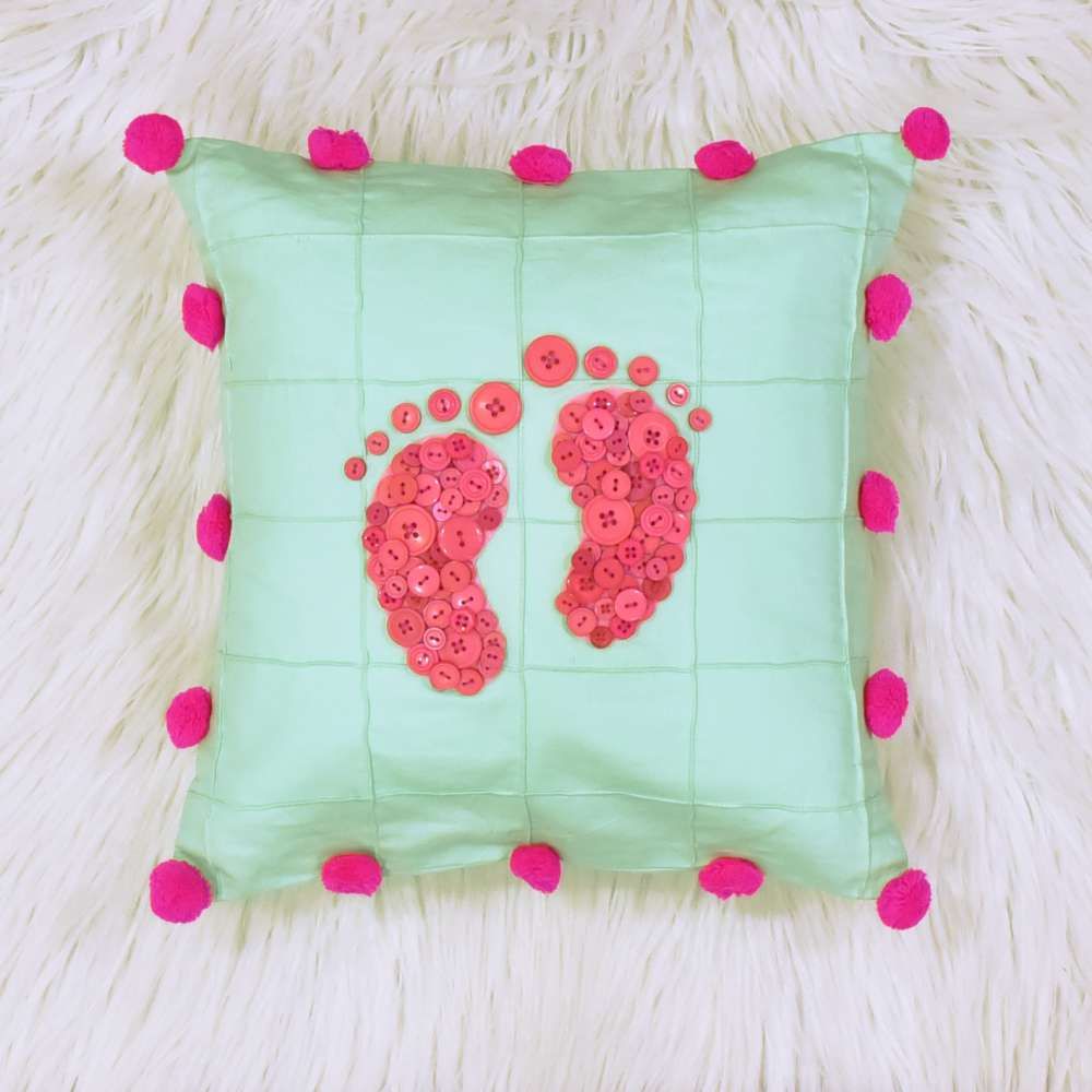 Happy Feet Button Cushion - Fuscia Pink Buttons On Pista Green Base