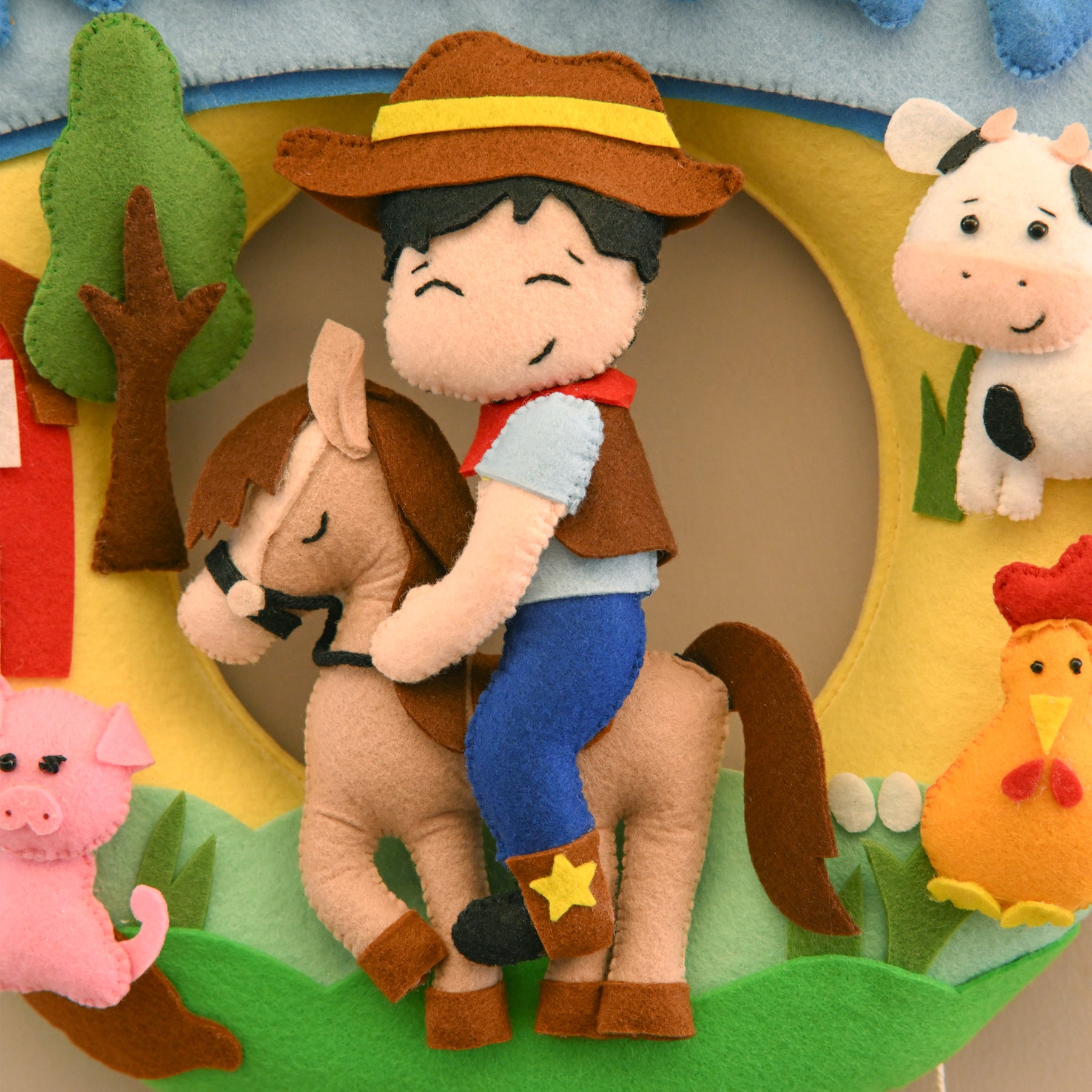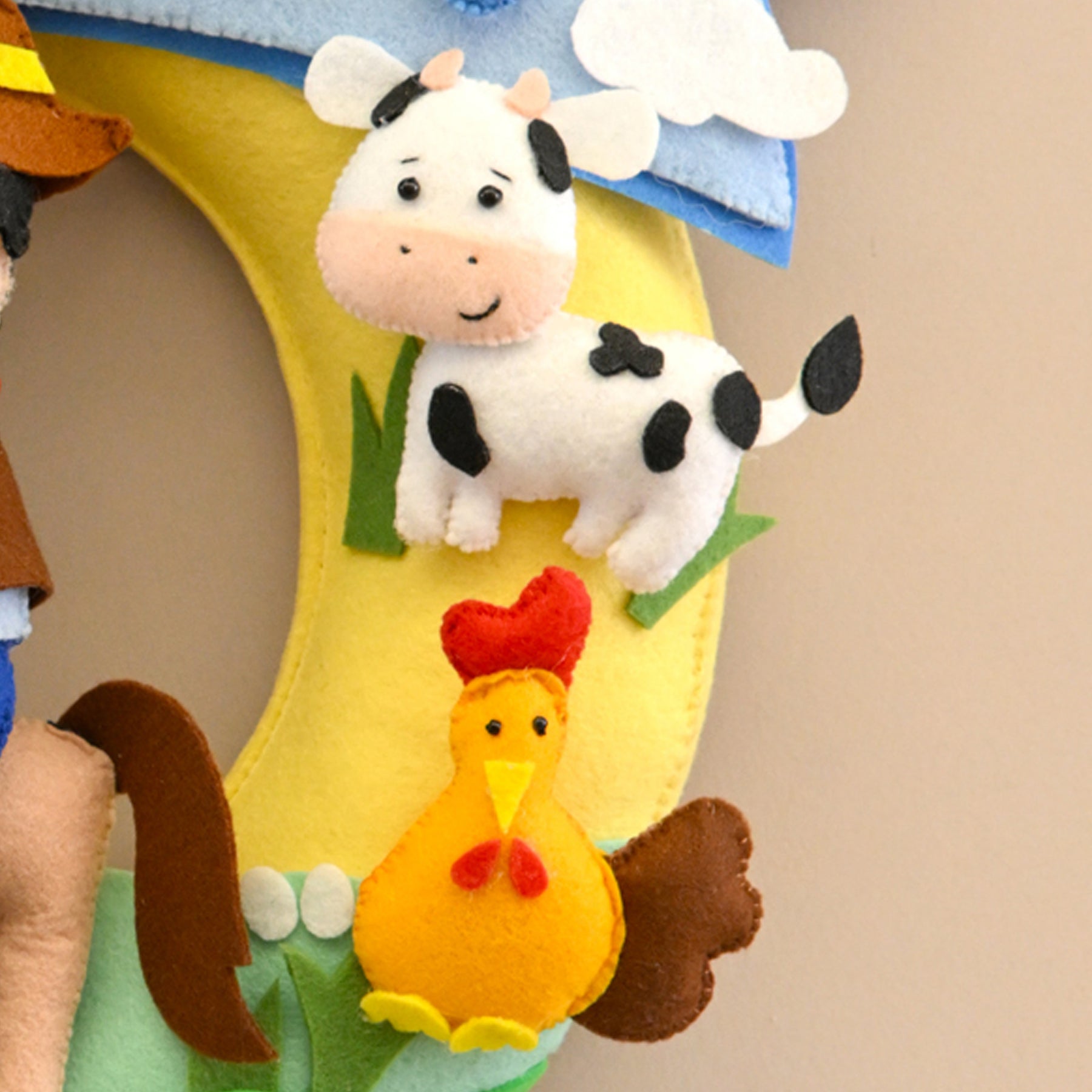 The Personalized Farm-Themed Name Wreath is a charming handcrafted decor piece featuring a cute farmer, playful animals, and a vibrant countryside scene. Customized with your child's name and special date, it adds a lively farm-inspired touch to nurseries or bedrooms, making it an ideal gift for animal-loving kids.