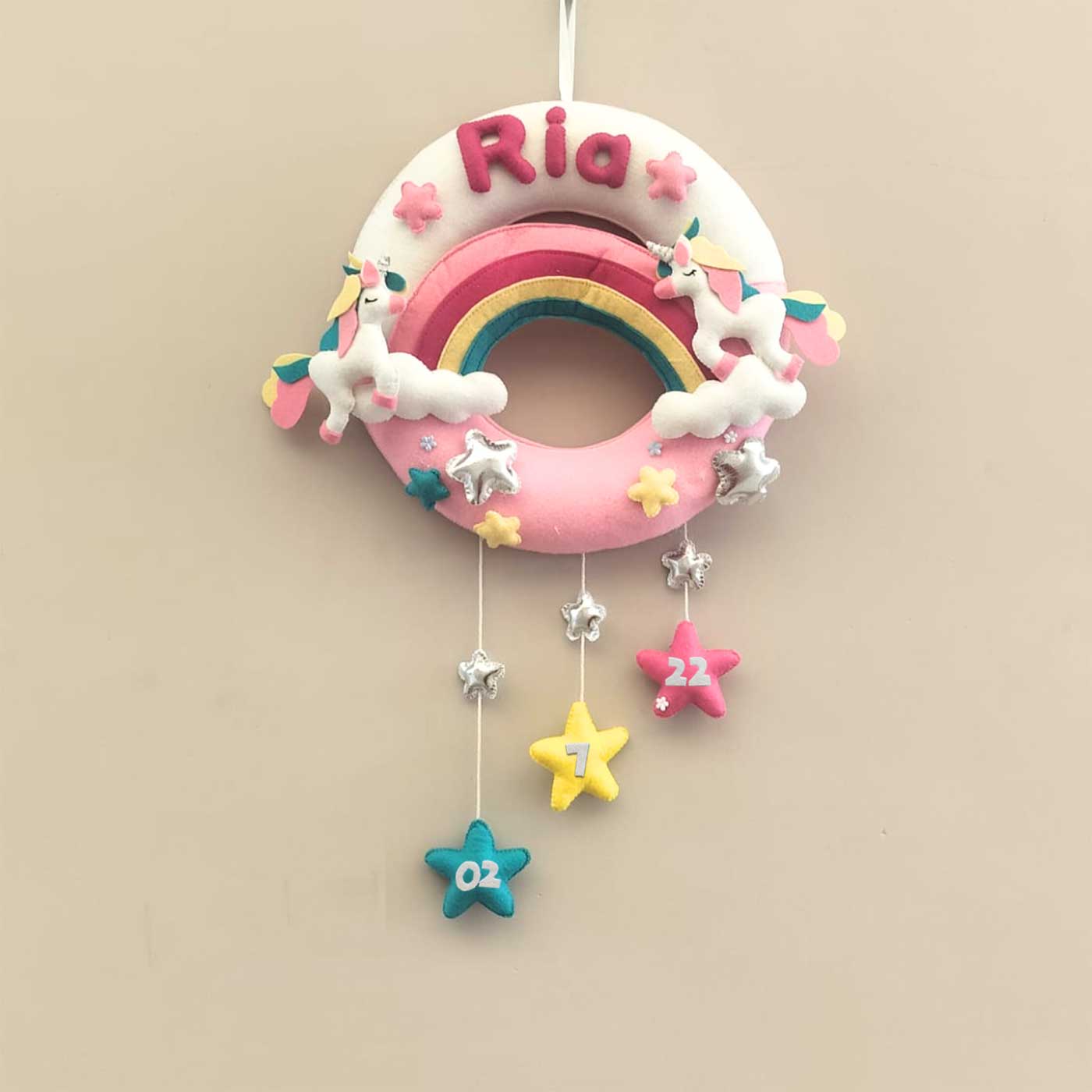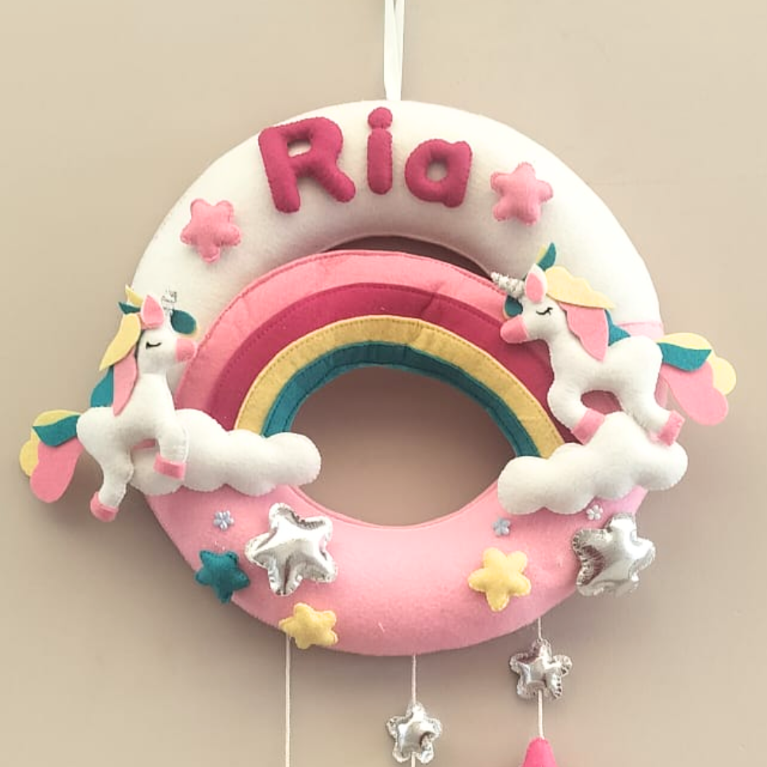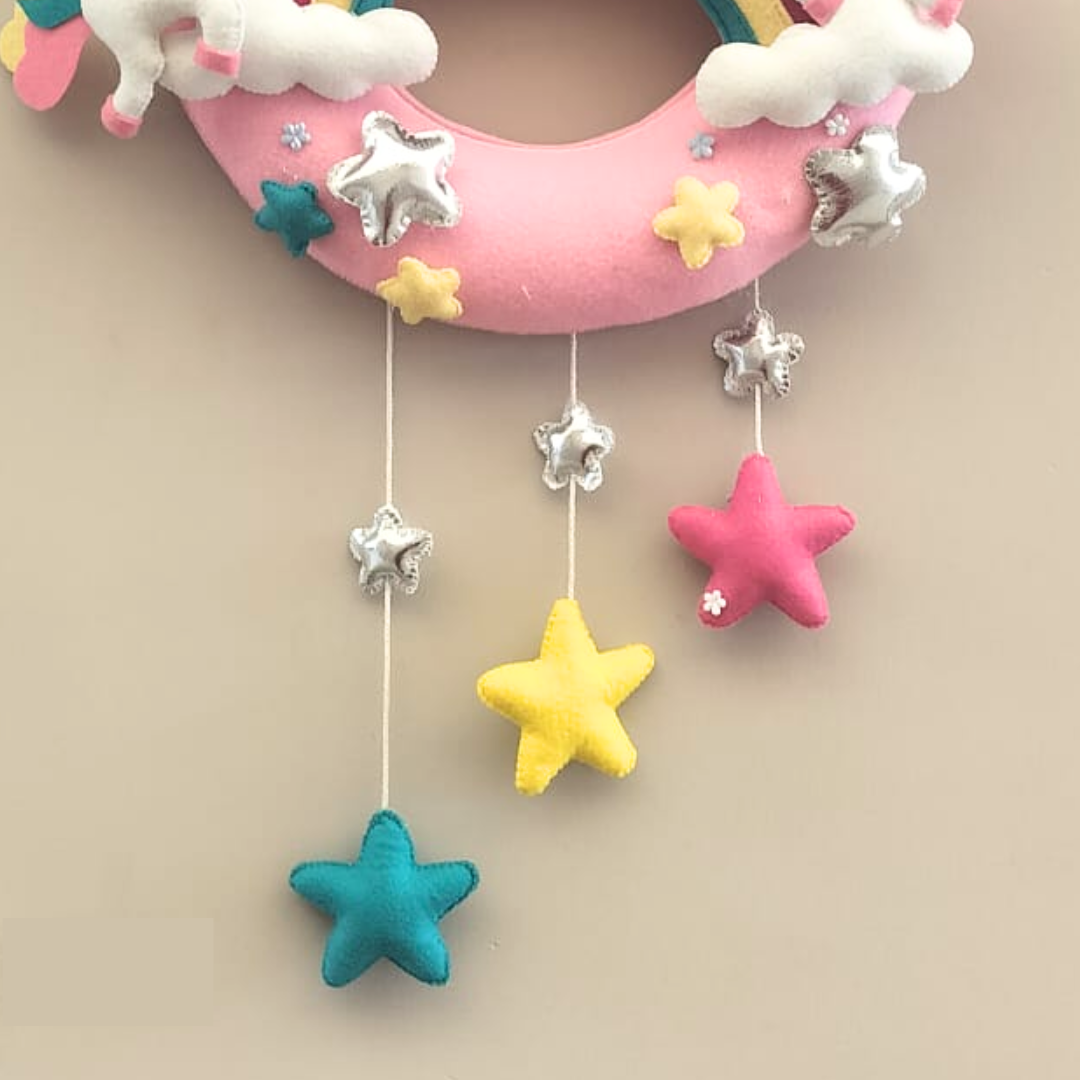 Transform your child’s room into a magical haven with this personalized unicorn and rainbow wreath. Designed with dreamy pastel colors, sparkling stars, and enchanting unicorns, this handcrafted decor adds a whimsical touch. Customize it with your child's name for a unique, heartwarming addition to their nursery or playroom.
