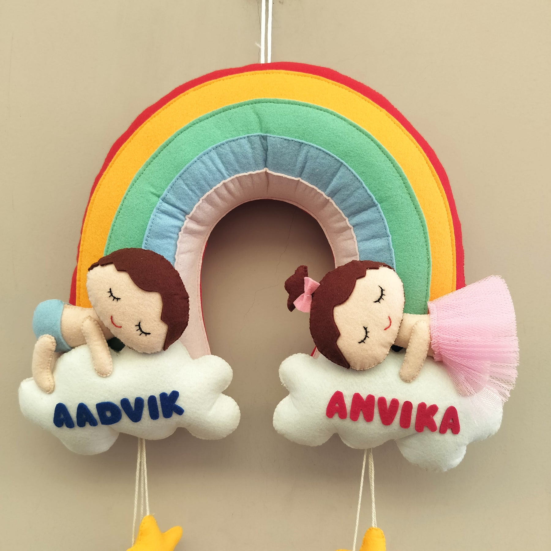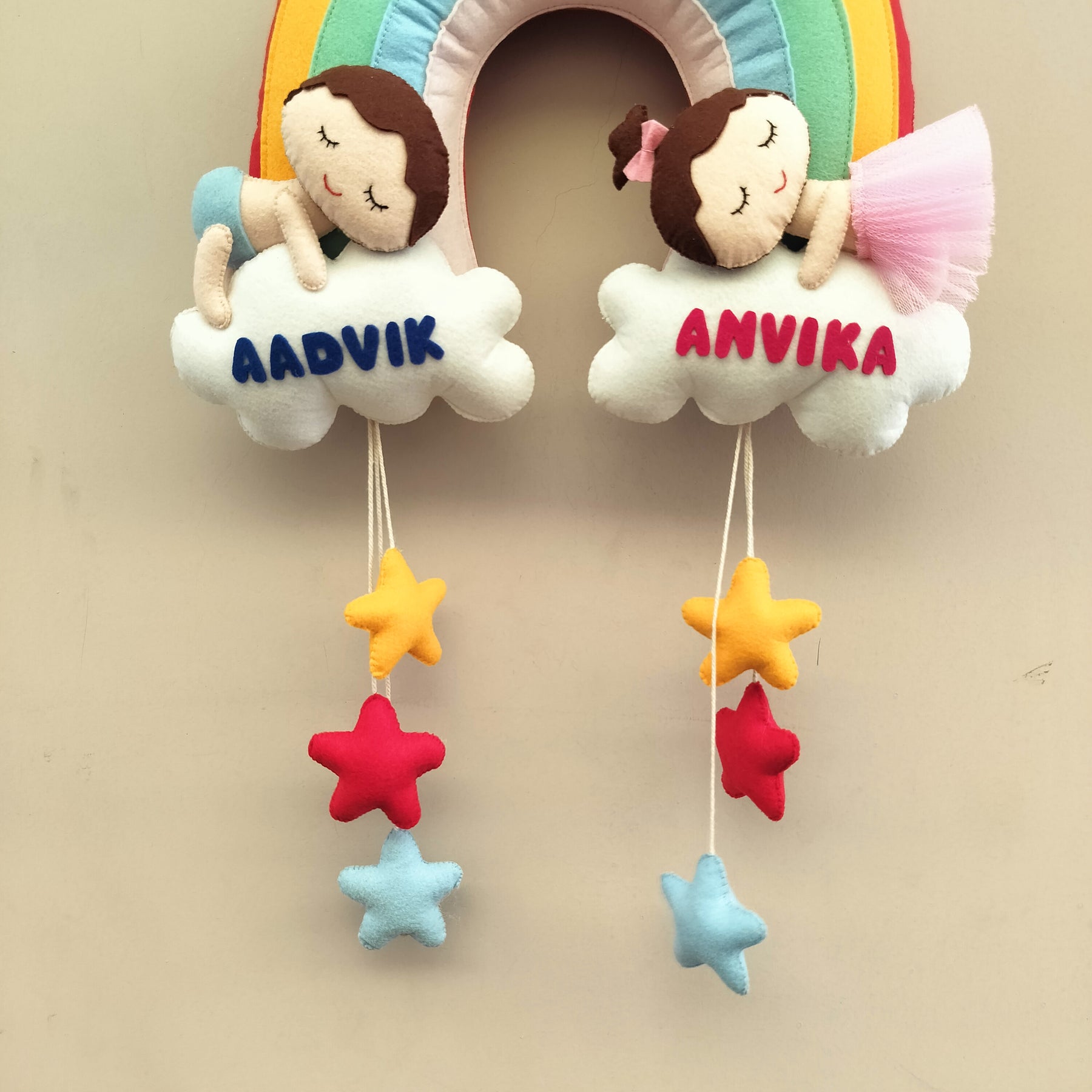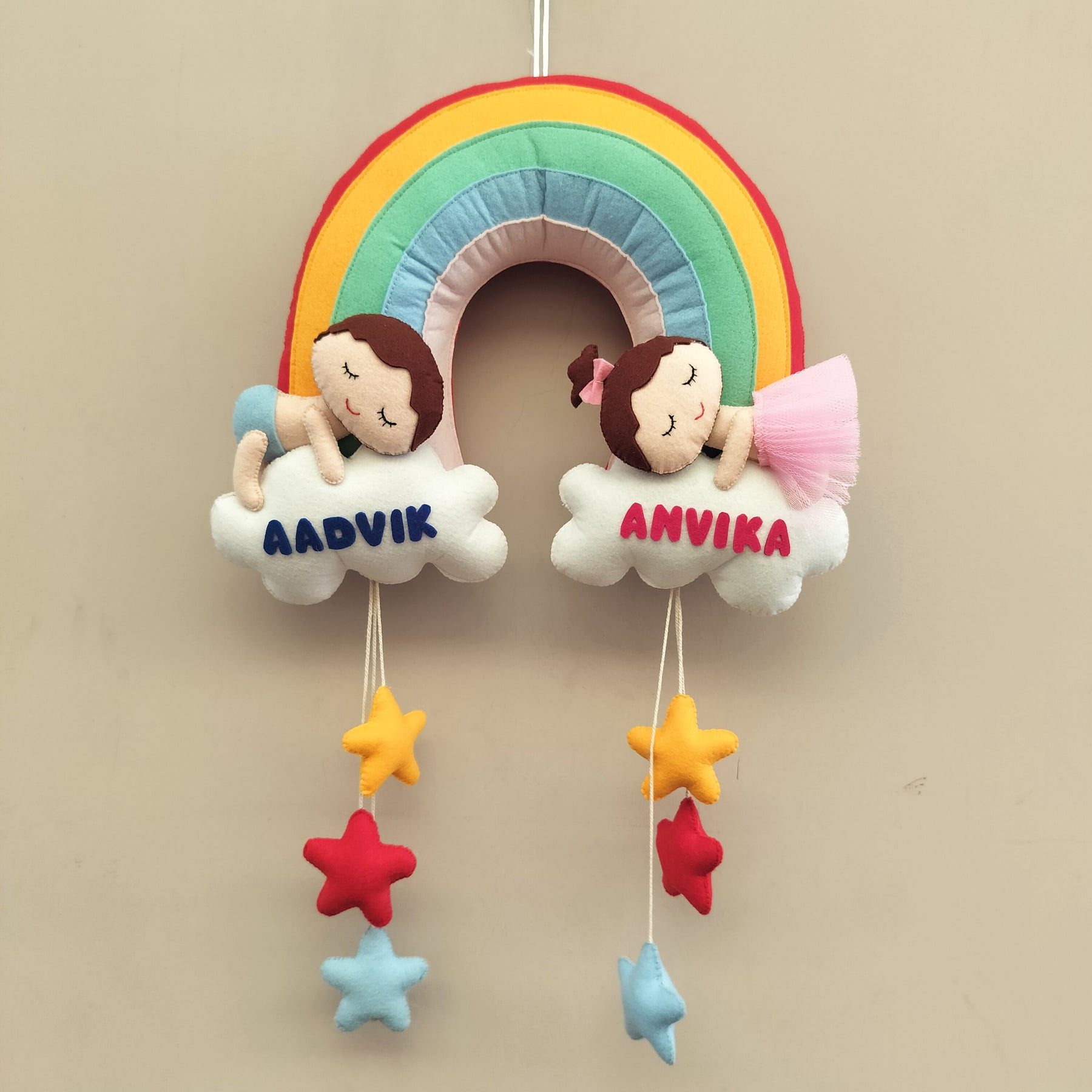 Add a burst of color and joy to any space with this custom handmade felt rainbow wall hanging. Featuring soft, vibrant felt in rainbow hues, this piece is perfect for personalizing with names, making it a thoughtful gift for Rakhi, baby showers, or nursery décor. Each wall hanging is lovingly crafted by hand with eco-friendly materials, ensuring both charm and durability. The cheerful rainbow, paired with fluffy clouds and playful design elements, brings warmth and positivity to any room. Ideal for celebrating siblings, welcoming a new baby, or simply brightening up a child’s space with a touch of handmade magic.