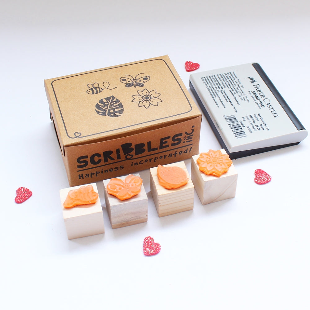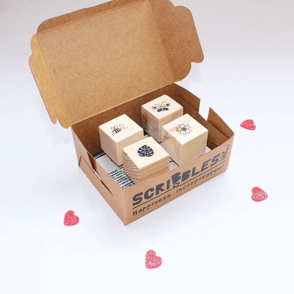 Mini Rubber stamps on a Wooden Mount - Set of 4 (Bee, Butterfly, Flower, Leaf)