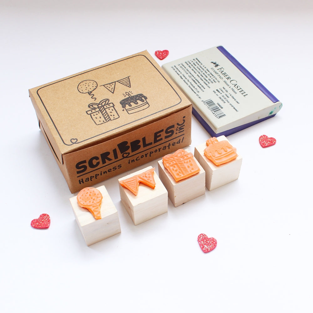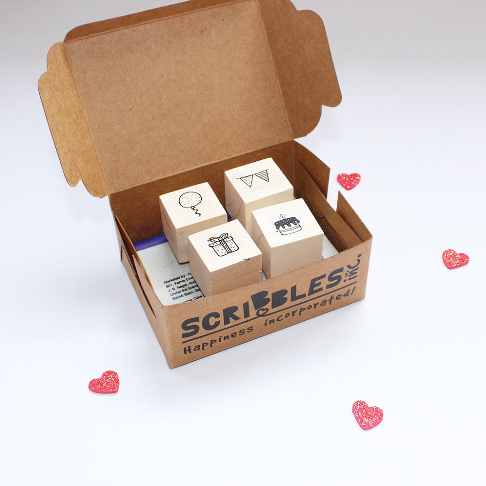 Mini Rubber stamps on a Wooden Mount - Set of 4 (Bunting, Balloon, Gift, Cake)