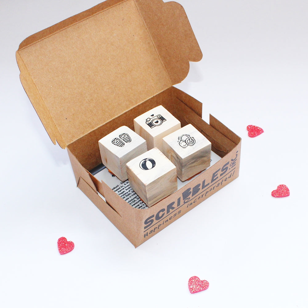 Mini Rubber stamps on a Wooden Mount - Set of 4 (Camera, Headphones, Slippers, Ball)