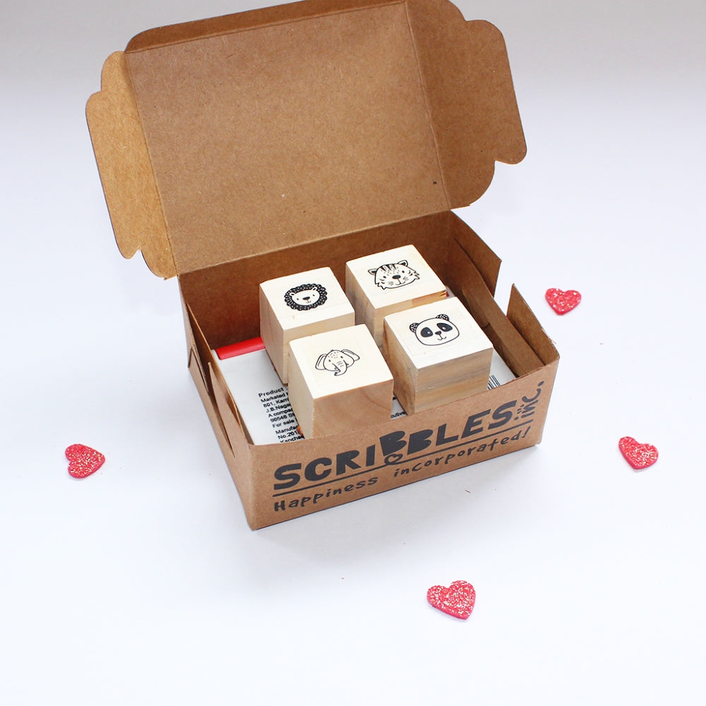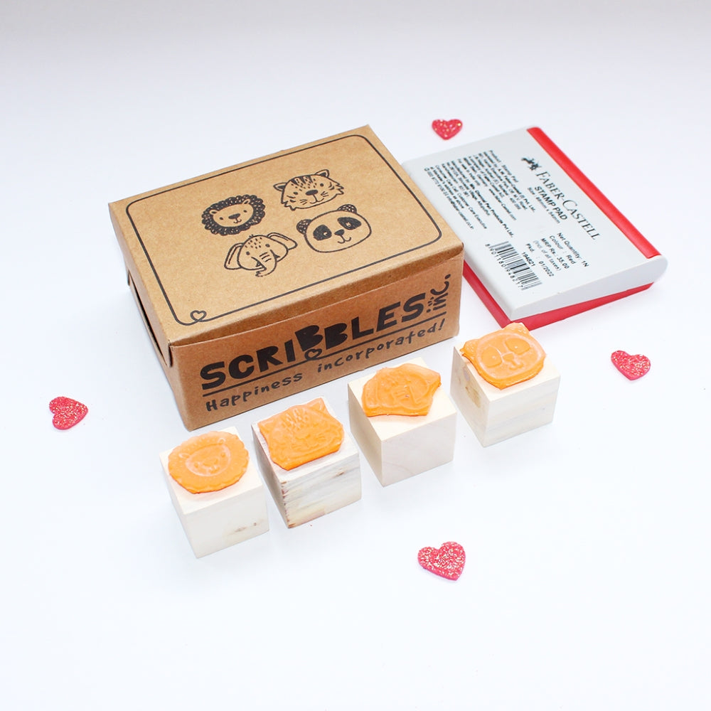 Mini Rubber stamps on a Wooden Mount - Set of 4 (Lion, Tiger, Panda, Elephant)