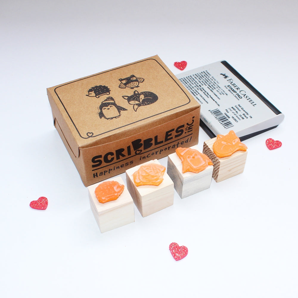 Mini Rubber stamps on a Wooden Mount - Set of 4 (Penguin, Fox, Owl, Hedgehog)