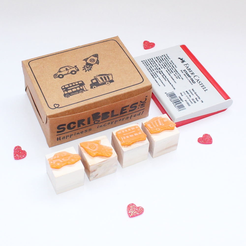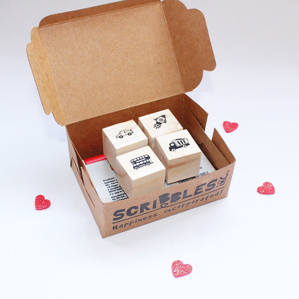 Mini Rubber stamps on a Wooden Mount - Set of 4 (Rocket, Car, Bus, Dump, Truck)