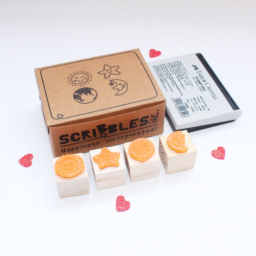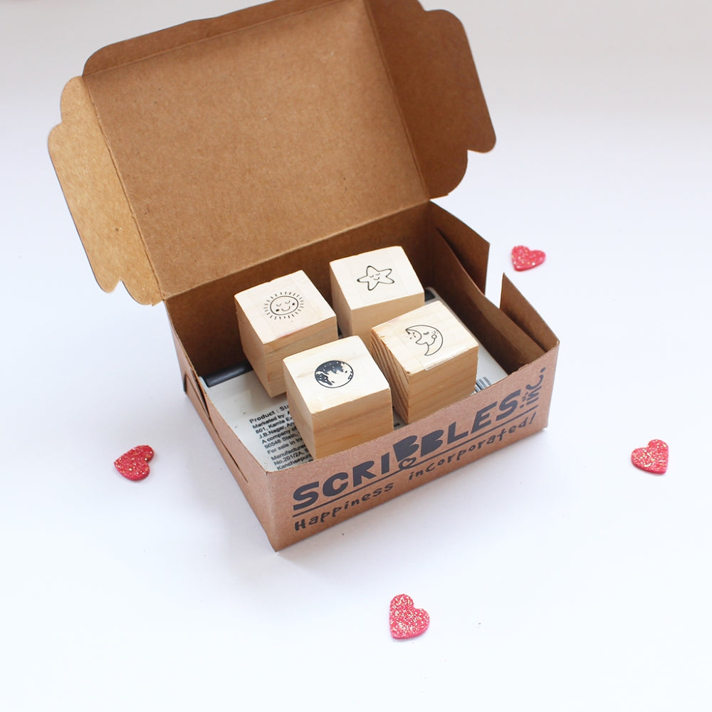 Mini Rubber stamps on a Wooden Mount - Set of 4 (Sun, Moon, Star, Earth)