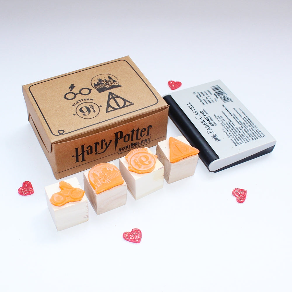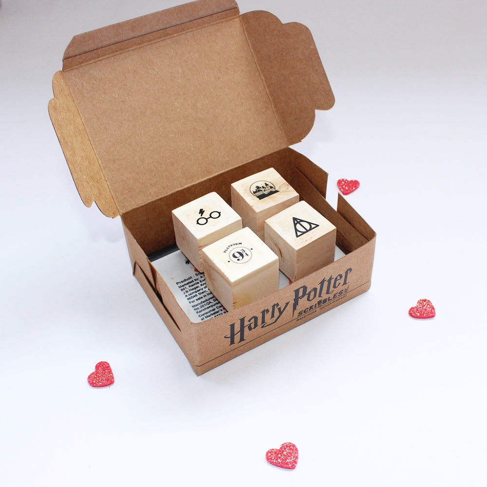 Official Harry Potter Mini Rubber Stamps on a Wooden Mount - Set of 4 (Hogwarts, DeathlyH, HPSymb, Plat 9 3/4)