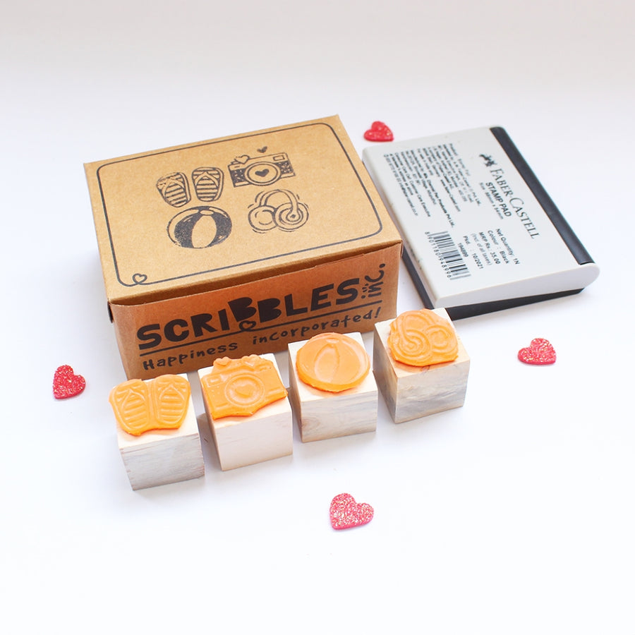 Mini Rubber stamps on a Wooden Mount - Set of 4 (Camera, Headphones, Slippers, Ball)