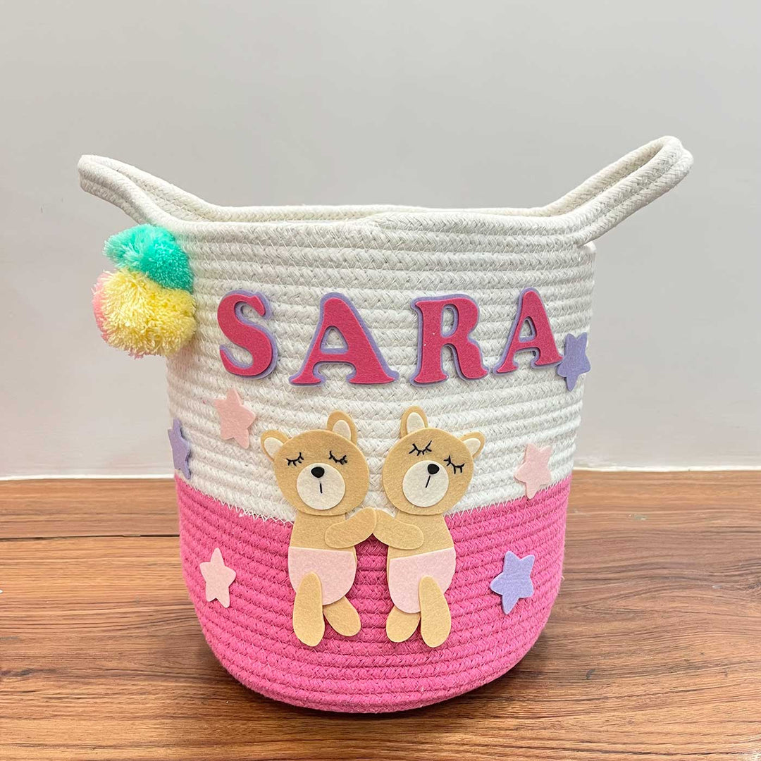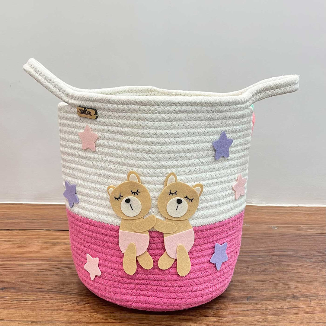 Our Basket crafted from durable jute and soft cotton, it offers both sturdiness and comfort. Perfect for carrying books, toys, or treasures, this basket is as functional as it is enchanting. Elevate your child's storage with a sprinkle of magic and practicality, and let their imagination soar among the stars. This Bear Hugs theme basket in bright hues serves as a dual purpose of both kid's room decor as well as storage made easy with two convenient sizes and comes embellished with delightful designs of Bear Hugs.