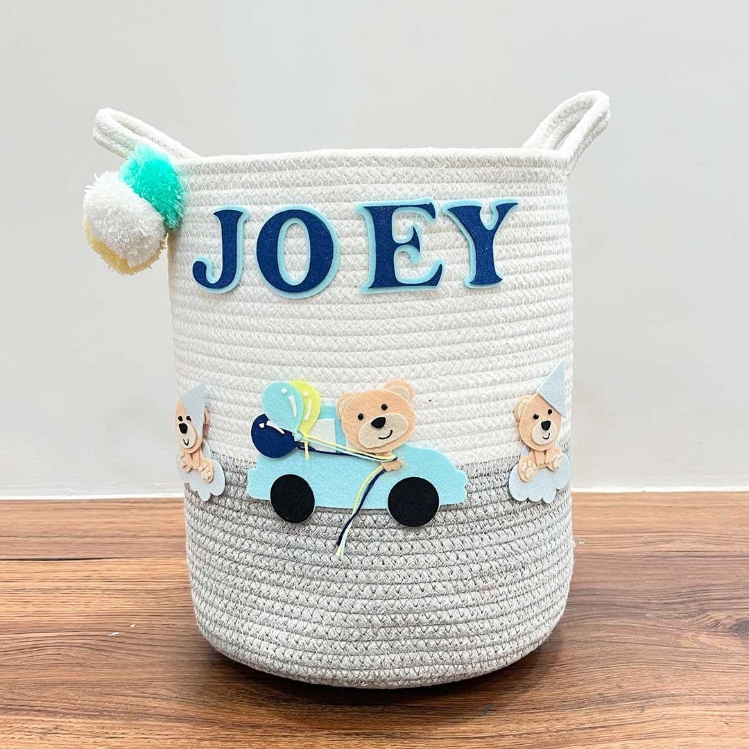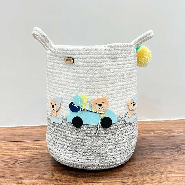 Our Basket crafted from durable jute and soft cotton, it offers both sturdiness and comfort. Perfect for carrying books, toys, or treasures, this basket is as functional as it is enchanting. Elevate your child's storage with a sprinkle of magic and practicality, and let their imagination soar among the stars. This Bear's Joyride theme basket in bright hues serves as a dual purpose of both kid's room decor as well as storage made easy with two convenient sizes and comes embellished with delightful designs of Bear Enjoying Ride in the Car .