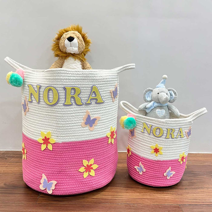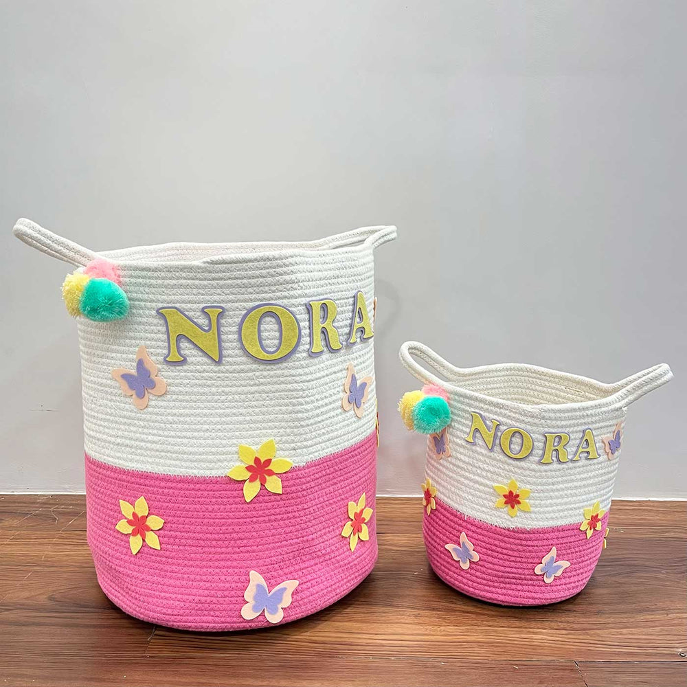 Our Basket crafted from durable jute and soft cotton, it offers both sturdiness and comfort. Perfect for carrying books, toys, or treasures, this basket is as functional as it is enchanting. Elevate your child's storage with a sprinkle of magic and practicality, and let their imagination soar among the stars. This Butterfly Blossoms theme basket in bright hues serves as a dual purpose of both kid's room decor as well as storage made easy with two convenient sizes and comes embellished with delightful designs of Butterfly and Flowers.