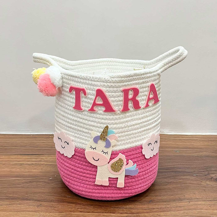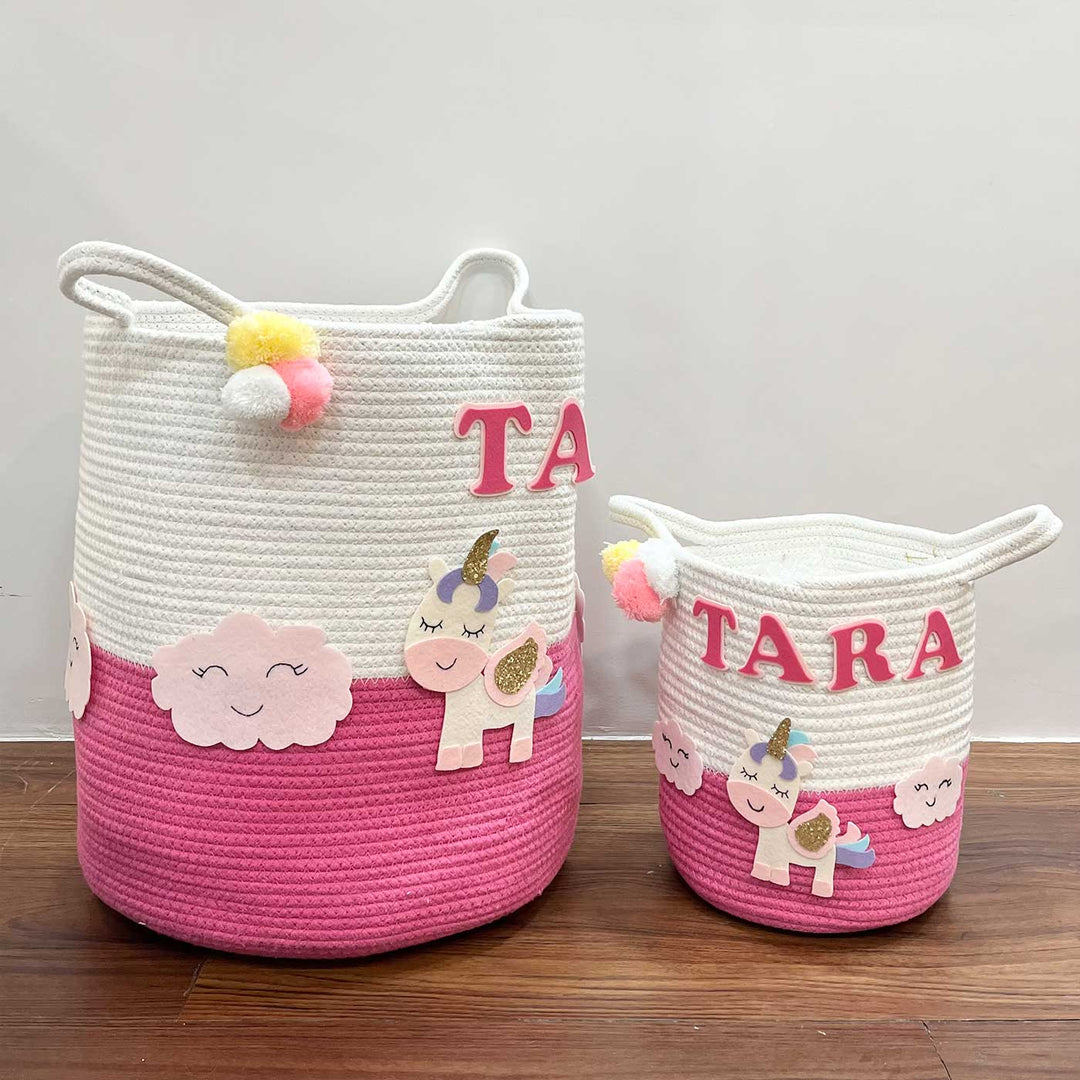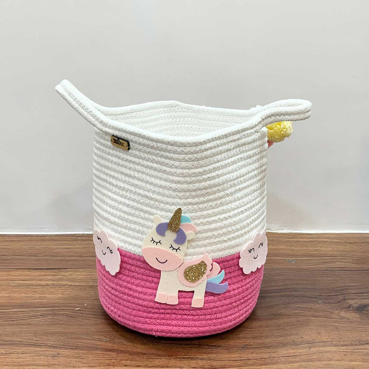 Our Basket crafted from durable jute and soft cotton, it offers both sturdiness and comfort. Perfect for carrying books, toys, or treasures, this basket is as functional as it is enchanting. Elevate your child's storage with a sprinkle of magic and practicality, and let their imagination soar among the stars. This Regal Roar theme basket in bright hues serves as a dual purpose of both kid's room decor as well as storage made easy with two convenient sizes and comes embellished with delightful designs of Unicorn, Cloud.