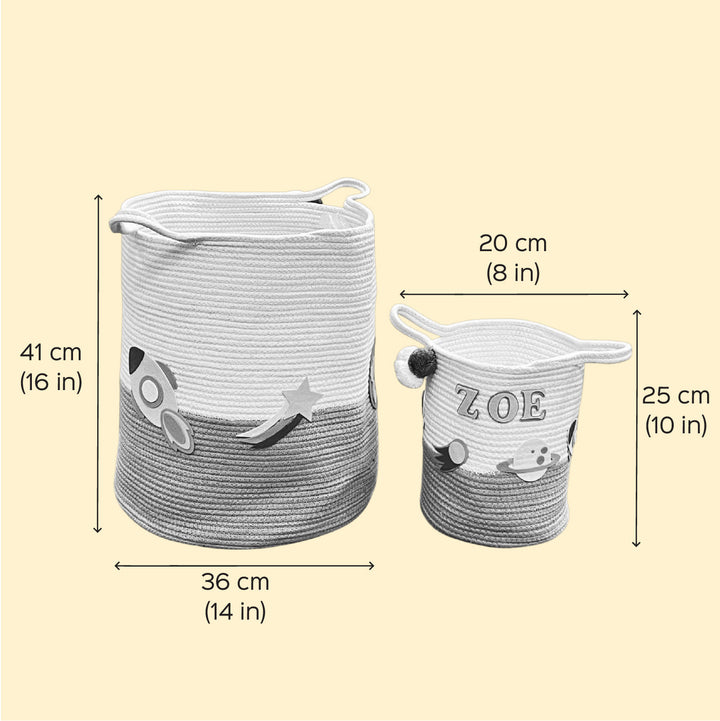 Our Basket crafted from durable jute and soft cotton, it offers both sturdiness and comfort. Perfect for carrying books, toys, or treasures, this basket is as functional as it is enchanting. Elevate your child's storage with a sprinkle of magic and practicality, and let their imagination soar among the stars. This Regal Roar theme basket in bright hues serves as a dual purpose of both kid's room decor as well as storage made easy with two convenient sizes and comes embellished with delightful designs of Rainbow, Cloud and Stars.