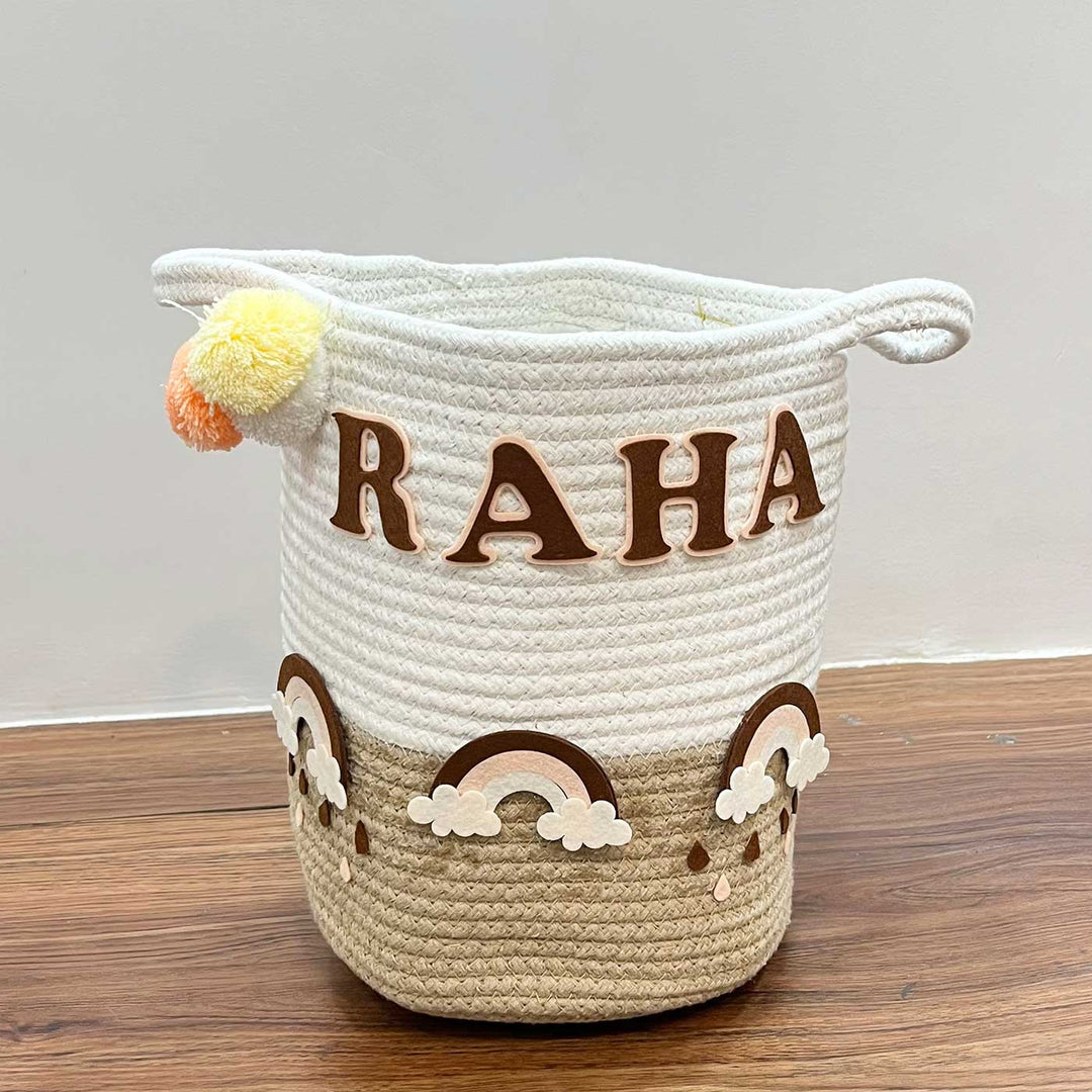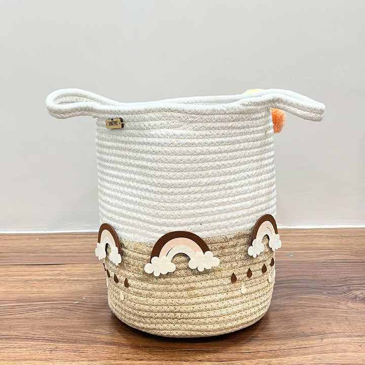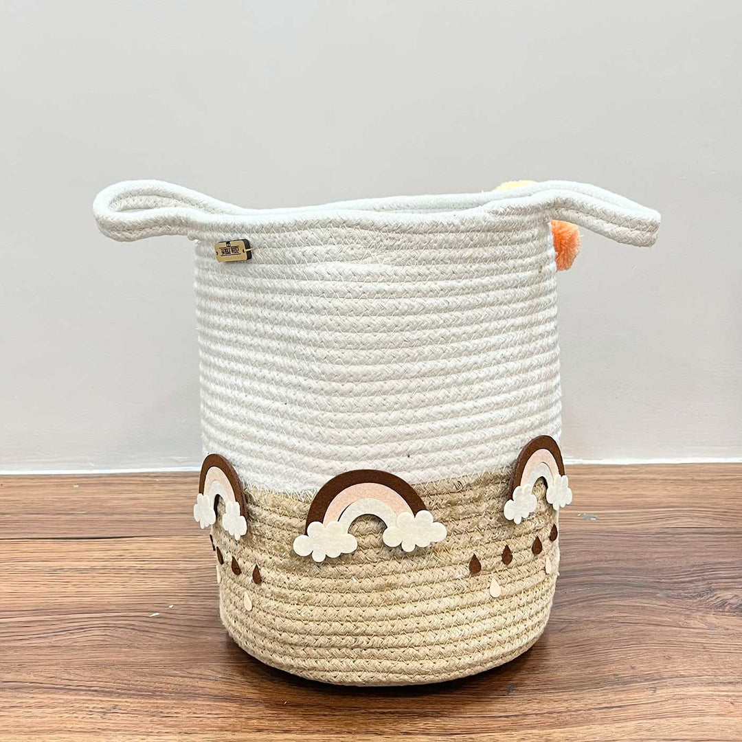 Our Basket crafted from durable jute and soft cotton, it offers both sturdiness and comfort. Perfect for carrying books, toys, or treasures, this basket is as functional as it is enchanting. Elevate your child's storage with a sprinkle of magic and practicality, and let their imagination soar among the stars. This Spectrum of Joy theme basket in bright hues serves as a dual purpose of both kid's room decor as well as storage made easy with two convenient sizes and comes embellished with delightful designs of Rainbow.
