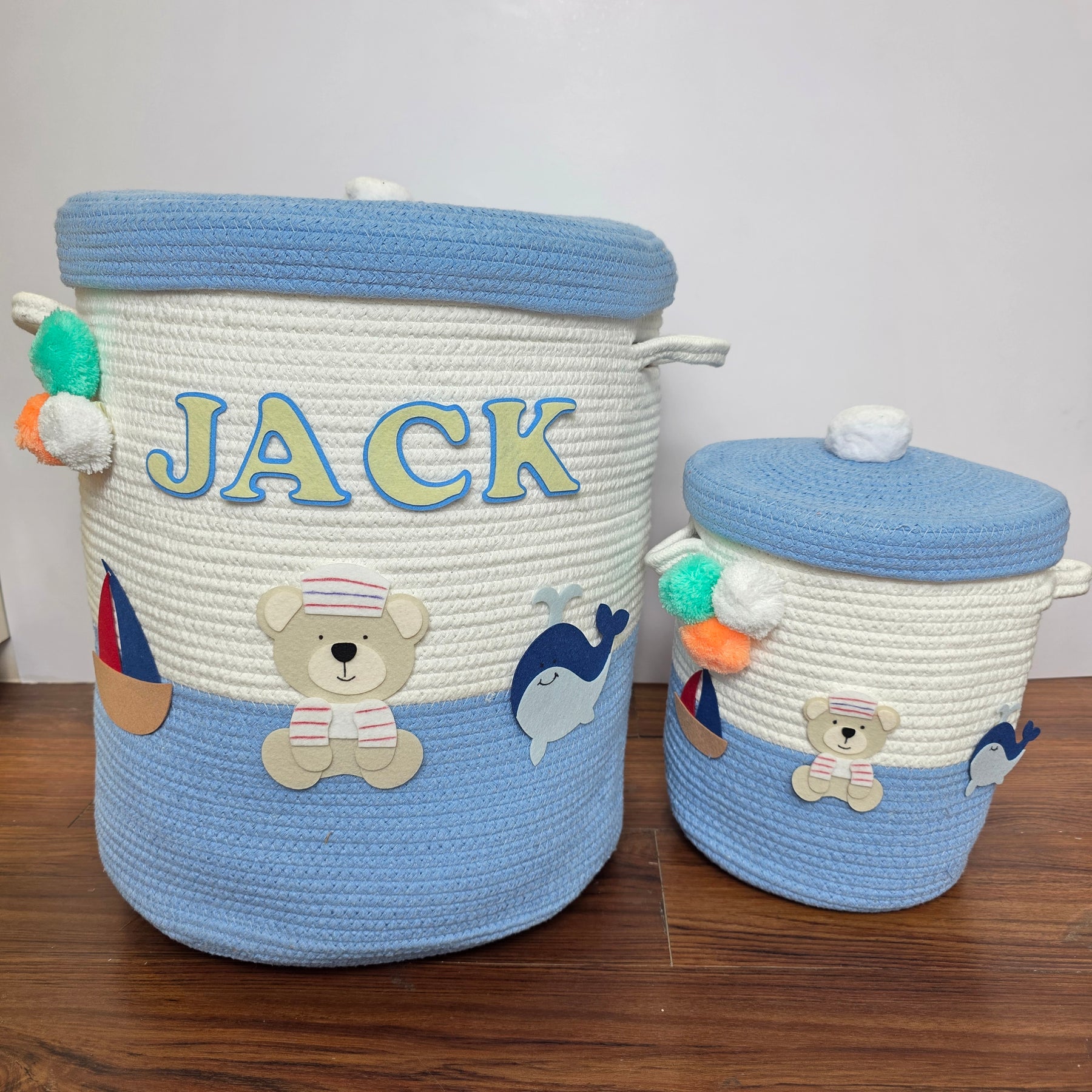 Babble Wrap Jute Cotton Storage Basket with Lid- Seaside Skies