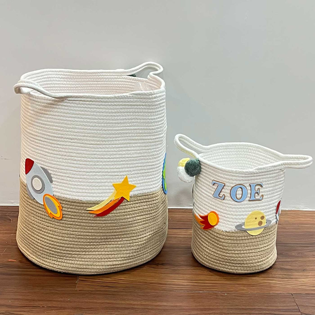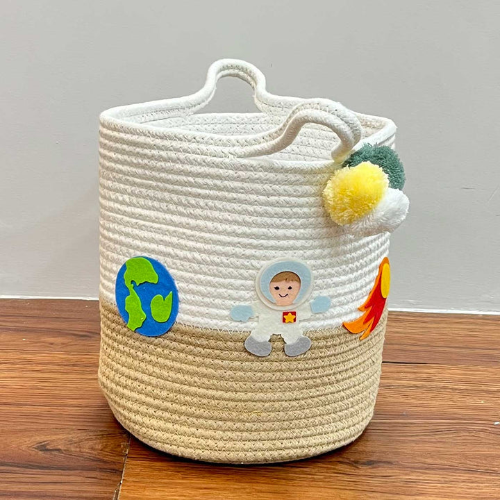 Our Basket crafted from durable jute and soft cotton, it offers both sturdiness and comfort. Perfect for carrying books, toys, or treasures from a galactic journey, this basket is as functional as it is enchanting. Elevate your child's storage with a sprinkle of cosmic magic and practicality, and let their imagination soar among the stars. This space theme basket in bright hues serves as a dual purpose of both kid's room decor as well as storage made easy with two convenient sizes and comes embellished with planets, astronaut, rocket and Earth.