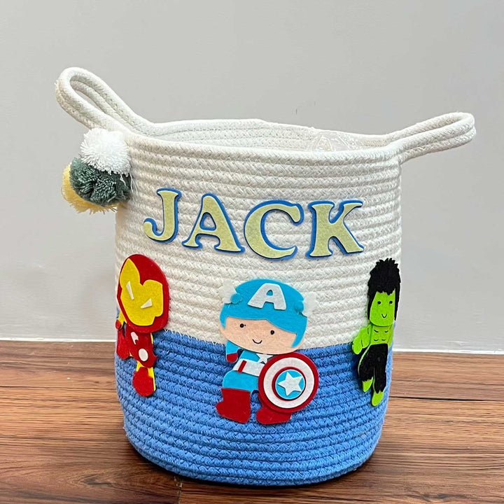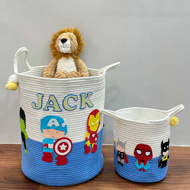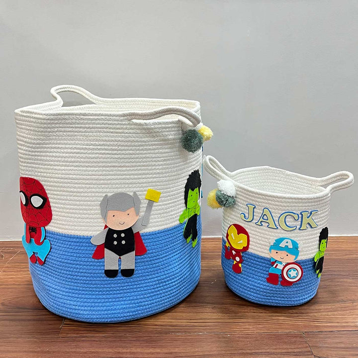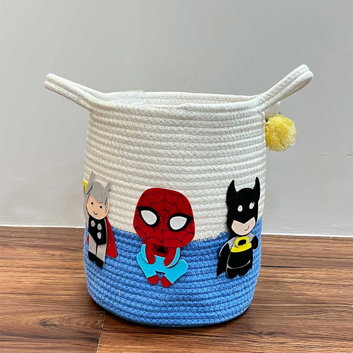 Our Basket crafted from durable jute and soft cotton, it offers both sturdiness and comfort. Perfect for carrying books, toys, or treasures, this basket is as functional as it is enchanting. Elevate your child's storage with a sprinkle of magic and practicality, and let their imagination soar among the stars. This Super hero theme basket in bright hues serves as a dual purpose of both kid's room decor as well as storage made easy with two convenient sizes and comes embellished with iconic superheroes including Hulk, Captain America, Spiderman, Batman, Ironman, and Thor.