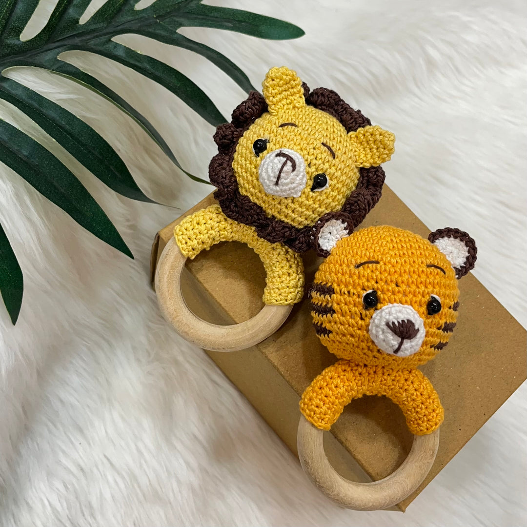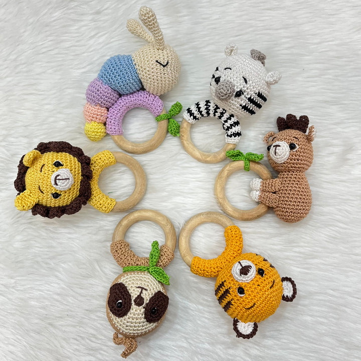 Our crochet rattle and teether is the perfect toy for your baby’s delicate needs. The organic cotton yarn provides a soft texture, while the wooden teether offers safe, natural relief for teething. Easy to hold, gentle to the touch, and designed with love for your little one. It's made for little hands to grip and explore.