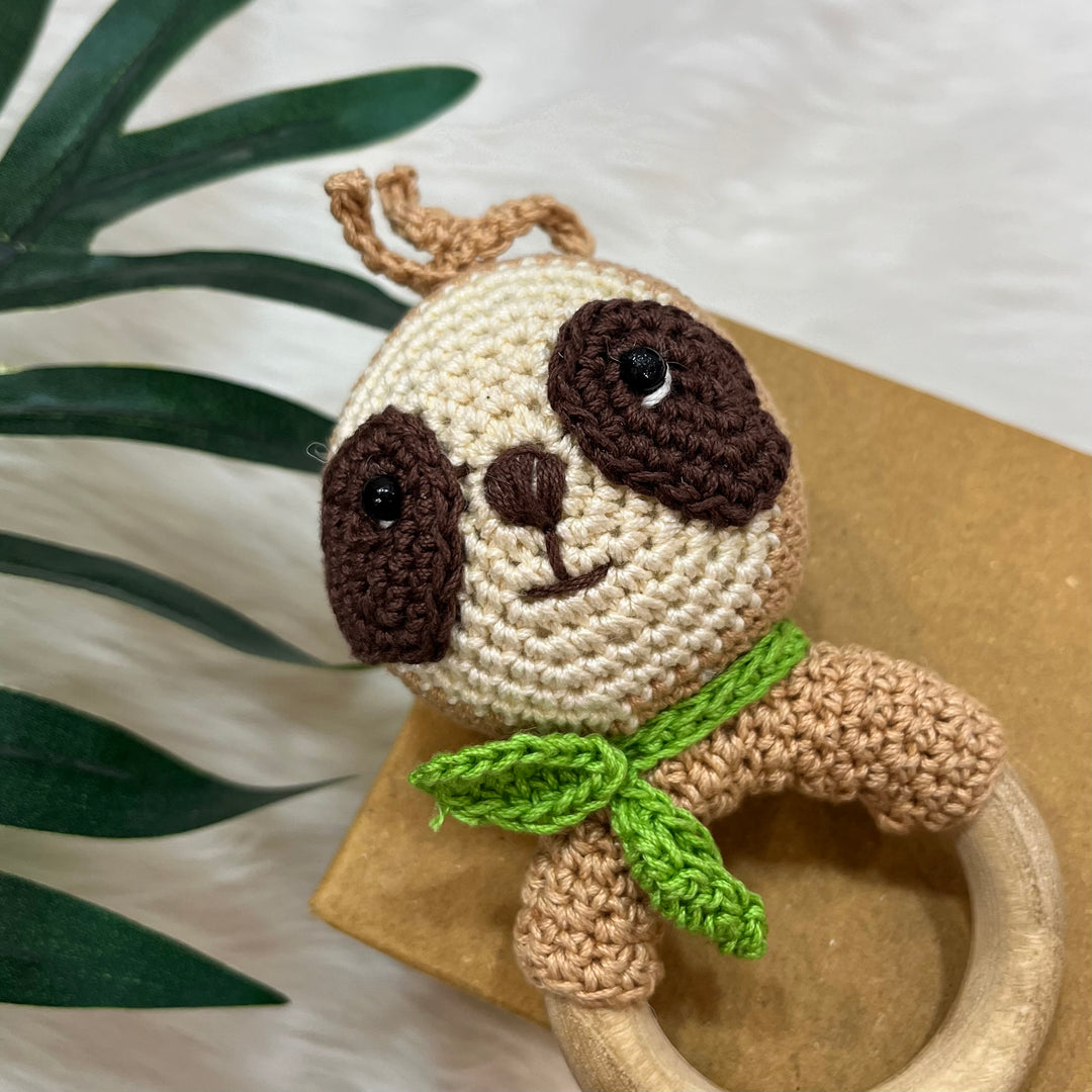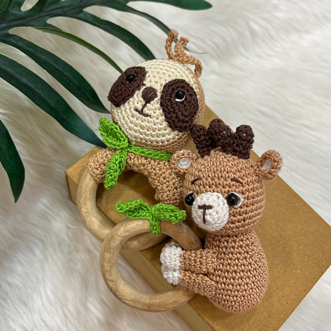 Our crochet rattle and teether is the perfect toy for your baby’s delicate needs. The organic cotton yarn provides a soft texture, while the wooden teether offers safe, natural relief for teething. Easy to hold, gentle to the touch, and designed with love for your little one. It's made for little hands to grip and explore.